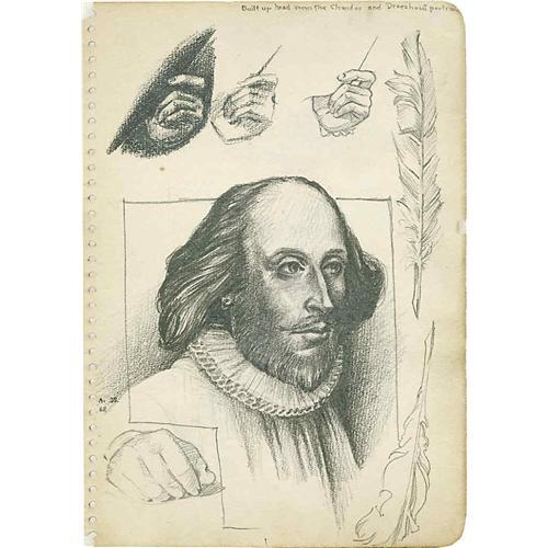 <B>Virgil Finlay - Portrait of William Shakespeare Pencil Study Original Art (circa 1935).</B></I> In preparation for his finished illustration on the cover of Wright's Shakespeare Library edition of <B>A Midsummer Night's Dream</B></I>, Virgil Finlay drew this tightly detailed pencil study of the Bard and his writing pen. Drawn on spiral-bound sketchbook paper, the drawing notes, "Built up head from the Chandos and Drochout portraits." The sketchbook paper has an overall size of 5" x 7". This drawing was professionally separated from the opposite side of the page and then archivally strengthened; otherwise it is in Excellent condition.