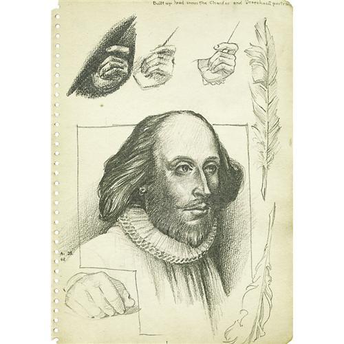 <B>Virgil Finlay - Portrait of William Shakespeare Pencil Study Original Art (circa 1935).</B></I> In preparation for his finished illustration on the cover of Farnsworth Wright's Shakespeare Library edition of <B>A Midsummer Night's Dream</B></I>, Virgil Finlay drew this tightly detailed pencil study of the Bard and his writing pen. Drawn on spiral-bound sketchbook paper, the drawing notes, "Built up head from the Chandos and Drochout portraits." The sketchbook paper has an overall size of 5" x 7". This drawing was professionally separated from the opposite side of the page and then archivally strengthened; otherwise it is in Excellent condition.