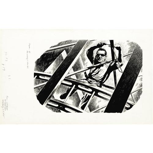 <B>Virgil Finlay - Pulp Illustration Original Art (undated).</B></I> This is an excellent example hyper-detailed scratchboard rendering by one of the illustration field's top sf-fantasy artists. Virgil Finlay was a master of the art of "stippling," but he also excelled at drybrush, scratchboard and plain old, straight-ahead line drawing! This drawing is titled "Chapter II - Man working in free fall." The piece has an overall size of 7" x 11", and the art is in Excellent condition. <BR><BR><B>Important notice:</B> Heritage usually auctions material at the rate of 200-250 lots per hour. On some occasions eBay Live bid software or the Internet may not be able to keep up with the pace of the auction. We recommend placing a realistic absentee bid now as insurance to avoid disappointment. Occasionally the auctioneer may eliminate or reject an eBay Live bid, and the auctioneer may also reopen a lot after the close of the eBay live bidding (usually because we missed an audience bid), and may reject your bid even if it shows you as the winning bidder. By bidding via eBay Live, you agree that Heritage may award the lot to another bidder at its sole discretion under the circumstances described above or any other reasonable circumstances. Since eBay bids are not shown to us until we open the lot on the floor, we treat those bids just like floor bids. In most cases the floor responds before the eBay bid is presented to us, due to Internet lag time, so for consistency we have made it a policy that floor bids are always considered first over tie eBay live bids. Also please note that all Heritage lots purchased through eBay Live carry a 22.5% Buyer's Premium. Please make sure you read the Terms and Conditions before you bid. This lot is being auctioned in conjunction with a live floor auction by Heritage Auction Galleries. All final auction and invoice information will be supplied by Heritage Auction Galleries, and all other information should be considered preliminary. Lot:41001 <BR><BR><B>Winning Notification and Billing:</B> After the FINAL session in this auction is complete, Heritage will send e-mail and snail mail invoices. This process normally takes several days. All final auction and invoice information will be supplied by Heritage Auction Galleries, and all other information should be considered preliminary. <BR><BR>This auction will be conducted on a live auction floor and over the Internet through eBay Live. If you choose to place an absentee bid, please take a moment to <font color='#0000ff'><u><a href='http://pages.ebay.com/liveauctions/help/before/laabsentee.html'>learn how eBay Live absentee bidding works</a></u></font><font color='#000000'>