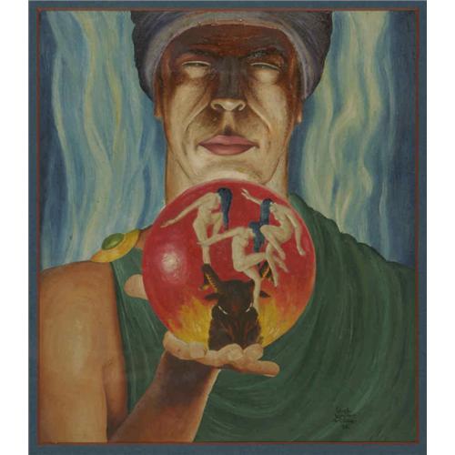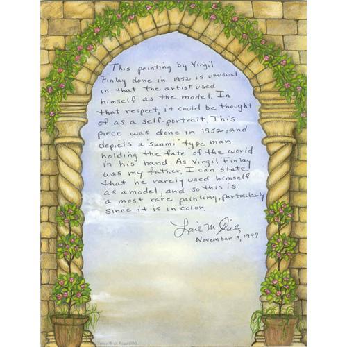 <B>Virgil Finlay - "Self Portrait of the Artist as a Young Man" Painting Original Art (1932).</B></I> Virgil Finlay's painting is rendered with the same care that he lavished on his famous ink illustrations. This painting is accompanied by a letter from Finlay's daughter, Lail Finlay, dated 11-05-99. It reads, "This painting by Virgil Finlay done in (1932) is unusual in that the artist used himself as a model. In that respect, it could be thought of as a self-portrait. This piece was done in (1932), and depicts a "swami" type man holding the fate of the world in his hand. As Virgil Finlay was my father, I can state that he rarely used himself as a model, and so this is a most rare painting, particularly since it is in color." (Note that while the handwritten text says "1952" rather than 1932, we are of the opinion that this is an oversight on the part of Ms. Finlay.) The painting has an image area of 9.75" x 11". There is a 1.5" crack on surface of the board (at the center-right edge) that does very little to detract from the enormous eye-appeal of this painting; otherwise, it is in Very Good condition. Don't miss an opportunity to bid on this scarcity -- an early Virgil Finlay self-portrait!