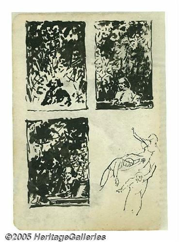 <B>Virgil Finlay - William Shakespeare Figure/Background Study Original Art (circa 1935).</B></I> Drawn in ink on spiral-bound sketchbook paper, Virgil Finlay played with the background patterns in three studies of William Shakespeare's portrait. The fourth study is of a group of figures. The paper has an overall size that measures 5" x 7". This drawing was professionally separated from the opposite side of the sketchbook page and then archivally strengthened; otherwise it is in Excellent condition.