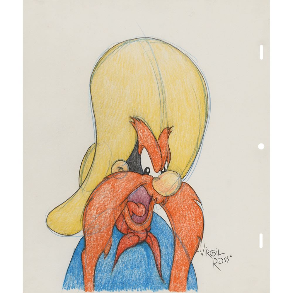 Terrific original drawing by Virgil Ross of Yosemite Sam, signed below in pencil by Ross. Accomplished in graphite and colored pencil on an untrimmed 10.5 x 12.5 sheet of animation paper. In fine condition.