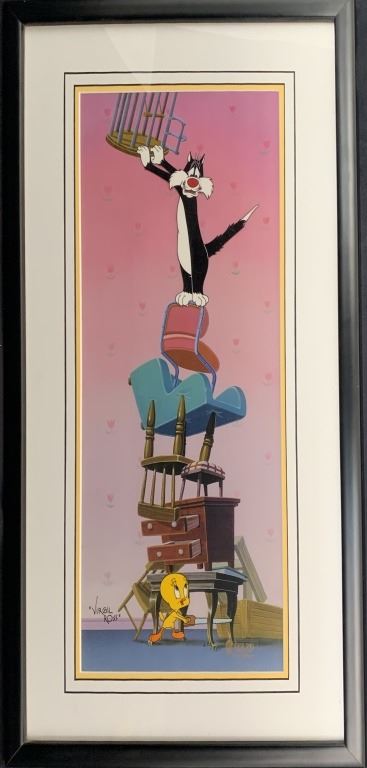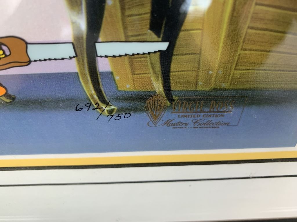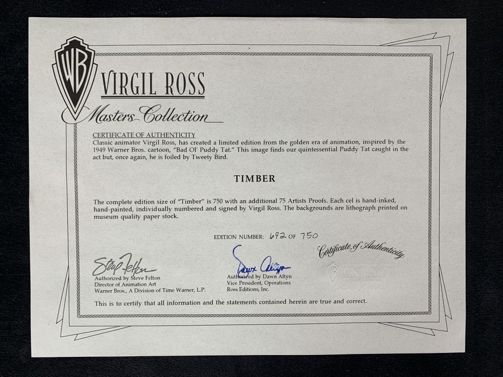 Virgil Ross's "Timber" limited edition cel, numbered 692/750. A lovely piece of Tweety Bird and Sylvester, professionally double matted with acid free matting, and custom framed under glass. Included with certificate of authenticity.