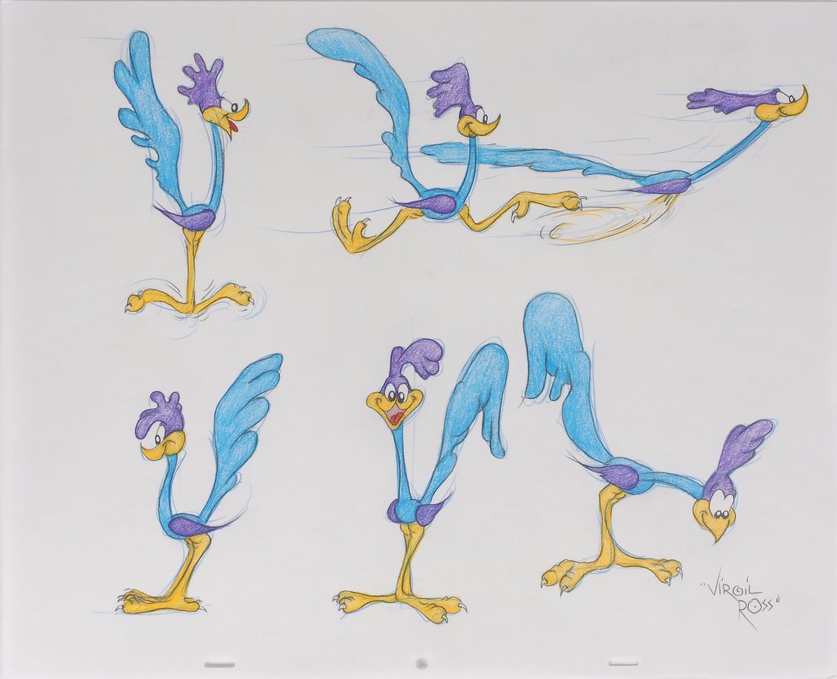 Original signed colored pencil sketch of Road Runner in six different poses on a white 16.5 x 13.5 sheet of animation paper, signed in the lower right in pencil, “Virgil Ross.” In fine condition.