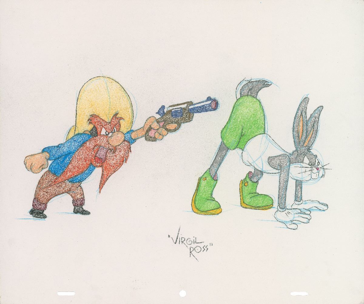 Original production drawing of Bugs Bunny pretending to be a track star as a disgruntled Yosemite Sam prepares to fire his pistol. Accomplished in graphite and colored pencil on untrimmed 12.5 x 10.5 animation paper. Signed below in pencil by Ross, “‘Virgil Ross.’” In fine condition. An appealing, nicely colored sketch.