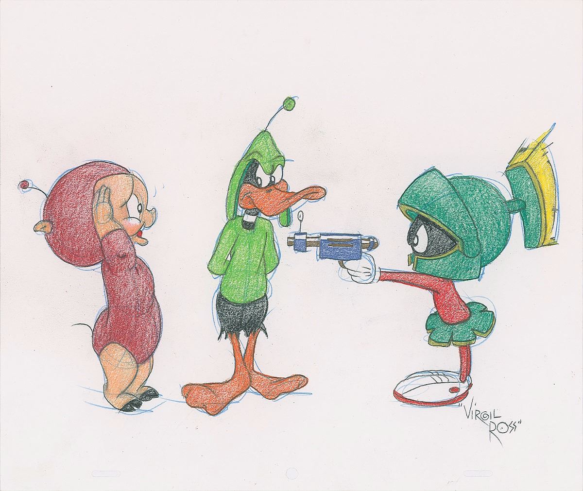 Original signed graphite and colored pencil sketch of Marvin the Martian angrily pointing his space gun at an irritated Duck Dodgers and his nervous assistant, Porky Pig, on a white 12.5 x 10.5 sheet of animation paper, signed in the lower right in pencil by Virgil Ross. In fine condition.