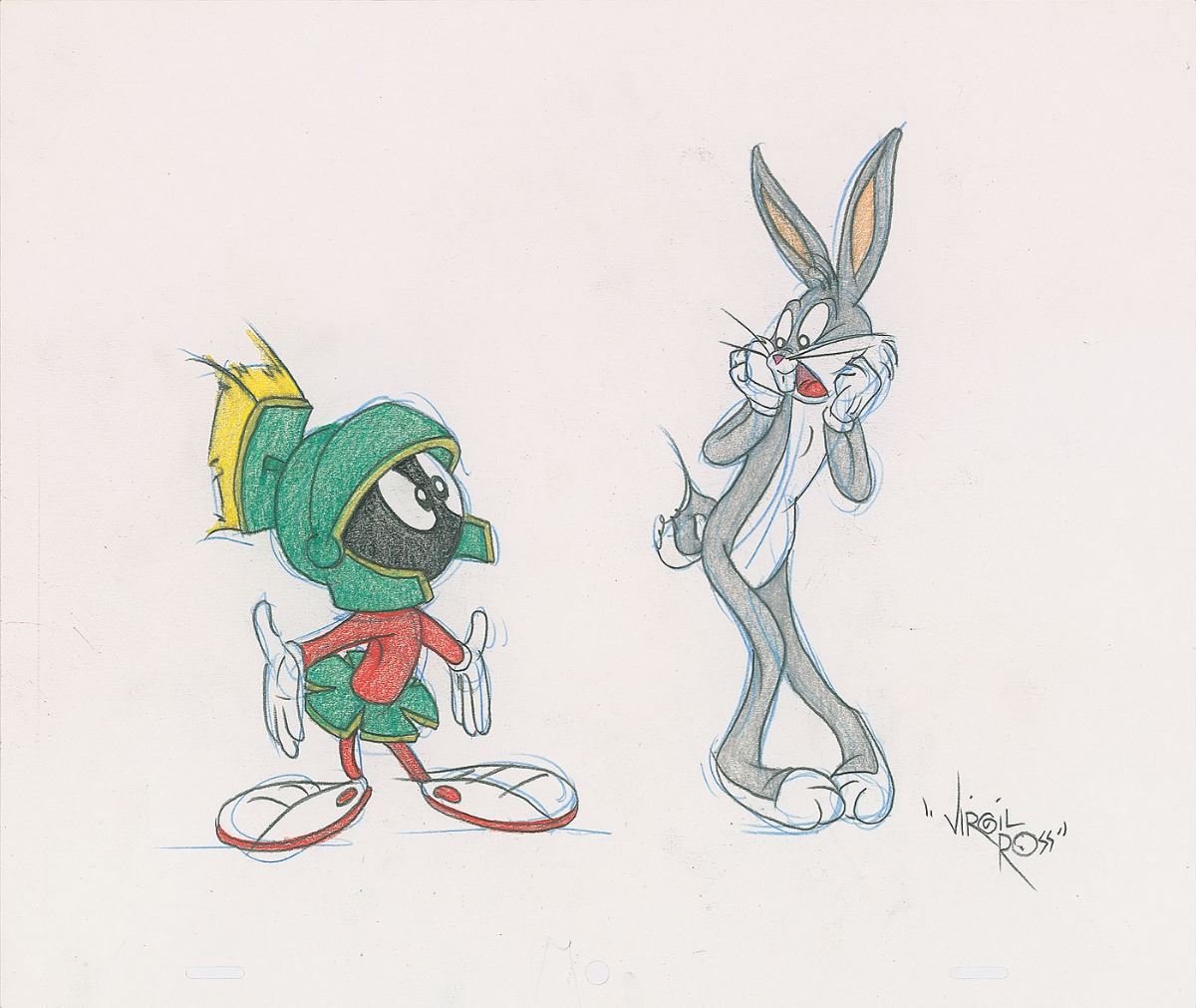 Original drawing by Virgil Ross of Marvin the Martian and a terrified Bugs Bunny, signed in the lower left in pencil by Ross. Accomplished in graphite and colored pencil on untrimmed 12.5 x 10.5 animation paper. Total image measures 7.5 x 7.25. In fine condition.