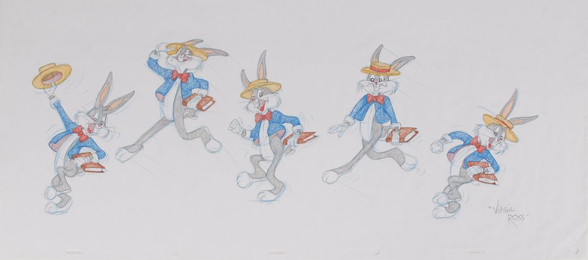 Original drawing by Virgil Ross of Bugs Bunny skipping through the air, signed in the lower right in pencil by Ross. Accomplished in graphite and colored pencil on untrimmed 23.5 x 10.5 animation paper. Total image measures 20 x 7. In fine condition.