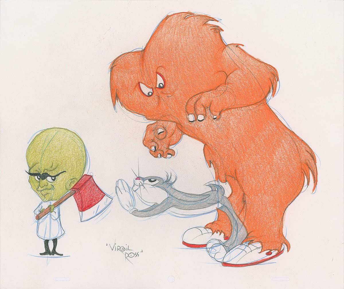 (Warner Brothers Studios, circa 1990s) Original drawing by Virgil Ross of Bugs Bunny pleading to the axe-wielding Mad Scientist as the massive Gossamer looms overhead, signed below in pencil by Ross. Accomplished in graphite and colored pencil on untrimmed 12.5 x 10.5 animation paper, with the total image measuring 10.5 x 9. In fine condition.