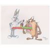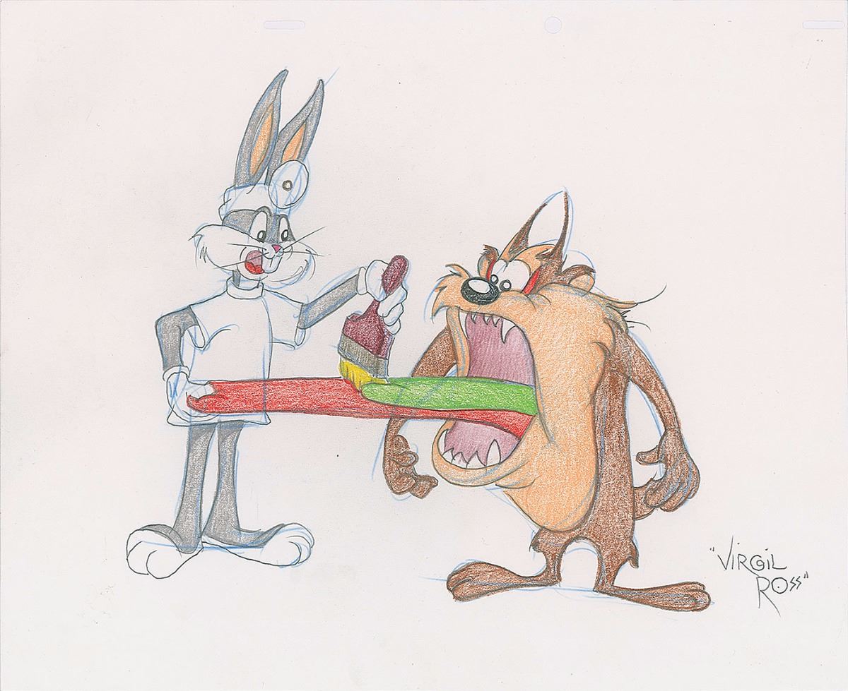 (Warner Brothers Studios, circa 1990s) Original drawing by Virgil Ross of Dr. Bugs Bunny painting a green line on the tongue of his patient, the Tasmanian Devil, signed below in pencil by Ross. Accomplished in graphite and colored pencil on animation paper trimmed to a size of 12.5 x 10.25, with the total image measuring 8.75 x 8. In fine condition.