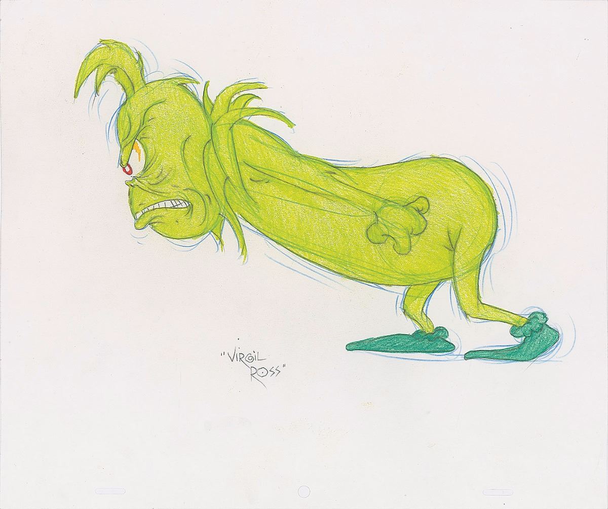 (Warner Brothers Studios, circa 1990s) Original drawing by Virgil Ross of the Grinch in a furious full-length pose, signed below in pencil by Ross. Accomplished in graphite and colored pencil on untrimmed 12.5 x 10.5 animation paper, with the image measuring 10.25 x 6.75. In fine condition.