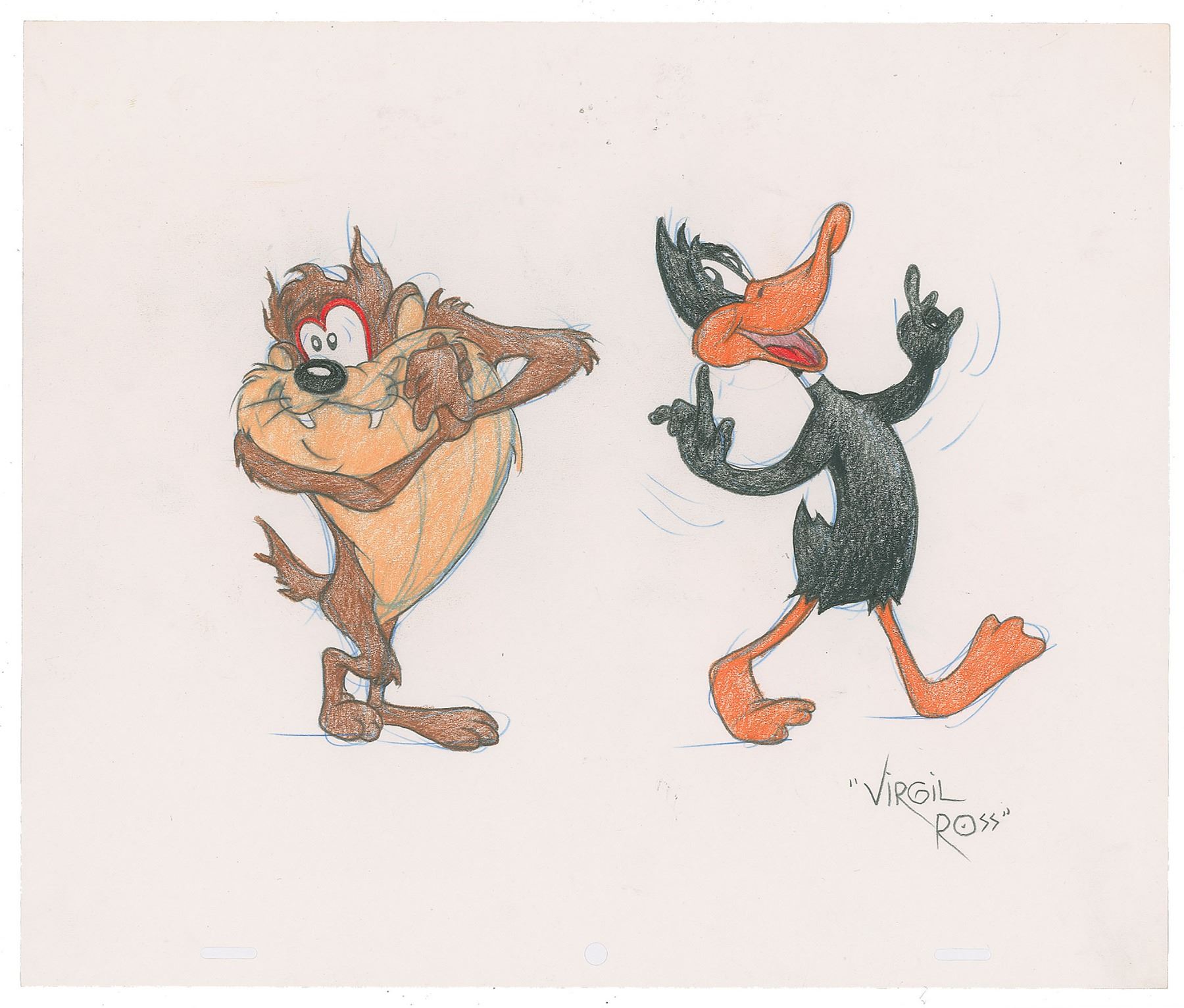 Original drawing by Virgil Ross of Daffy Duck and the Tasmanian Devil side-by-side, signed in the lower right in pencil by Ross. Accomplished in graphite and colored pencil on untrimmed 12.5 x 10.5 animation paper. Daffy measures 4.5 x 6 and Taz measures 4 x 5.75. In fine condition.