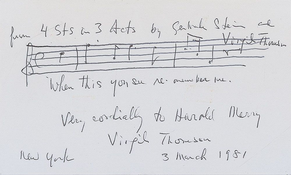 AMQS on an off-white 5 x 3 card. Thomson pens three bars of music and lyrics from ‘Four Saints in Three Acts,’ identified at the top, “from 4 Sts in 3 Acts by Gertrude Stein and Virgil Thomson,” and signed and inscribed, “Very cordially to Harold Merry, Virgil Thomson, New York, 3 March 1981.” In fine condition.