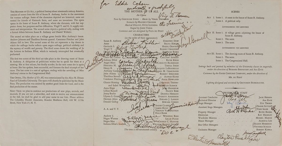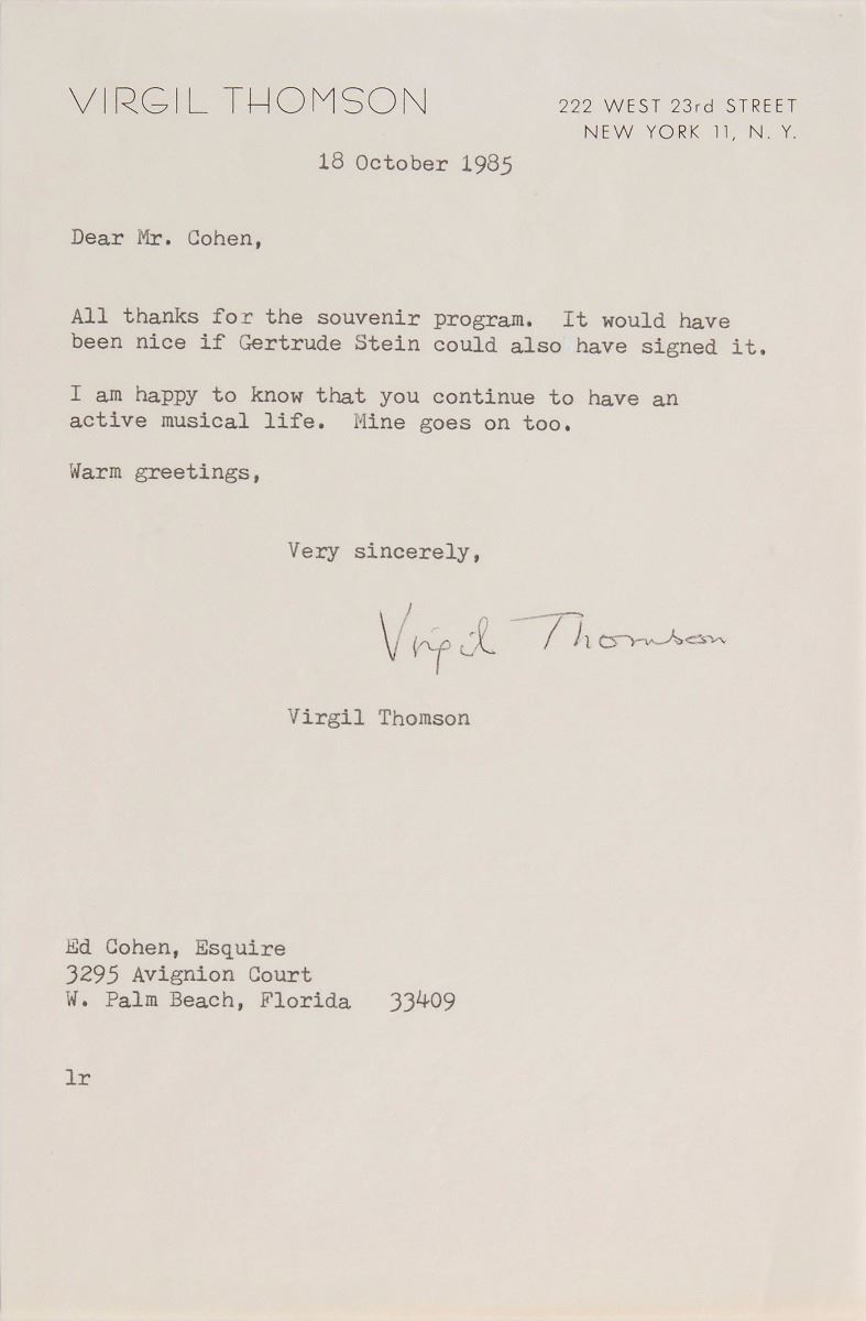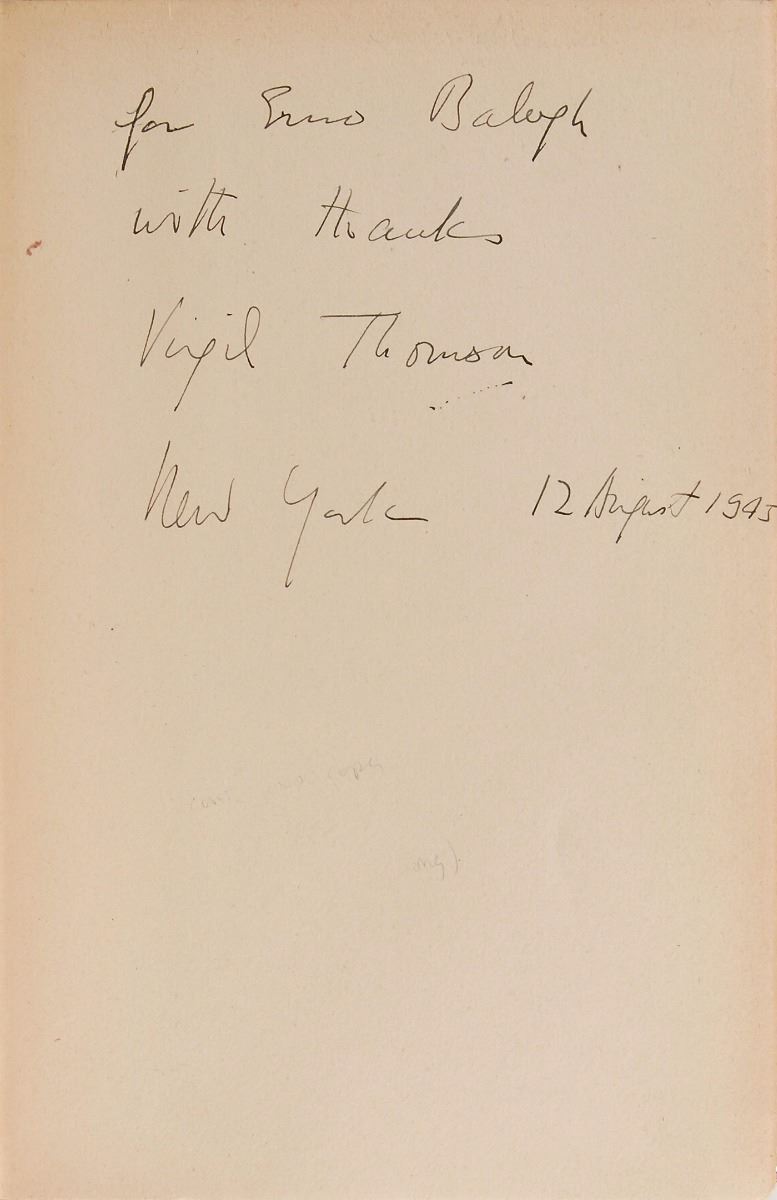 Three items: a program for the 1947 world premiere of The Mother of Us All, six pages, signed and inscribed to fellow composer Edward Cohen by Thomson, and also signed by conductor Otto Luening and most members of the cast; a TLS to Cohen on personal letterhead, one page, October 18, 1985, in part: “Thanks for the souvenir program. It would have been nice if Gertrude Stein could also have signed it”; and a first edition hardcover of The Musical Scene, with dust jacket, signed and inscribed to the composer and pianist Erno Balogh. In overall fine condition. Accompanied by the original mailing envelope for the letter