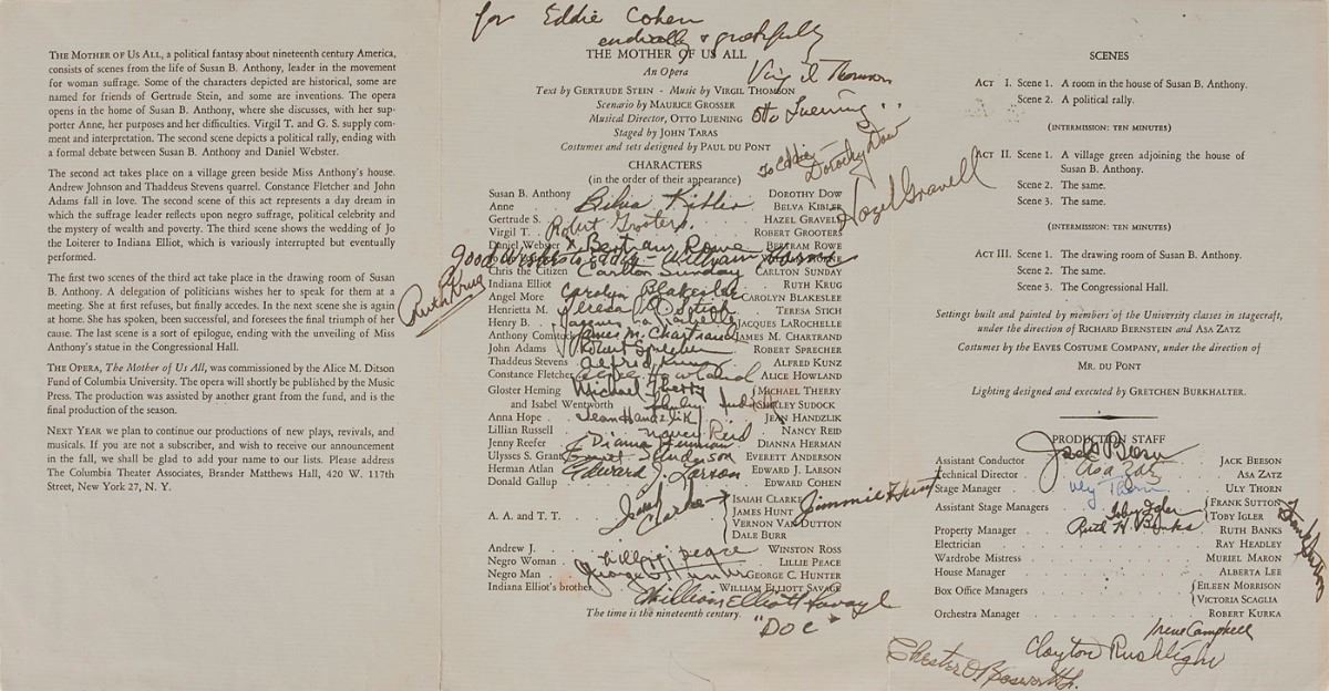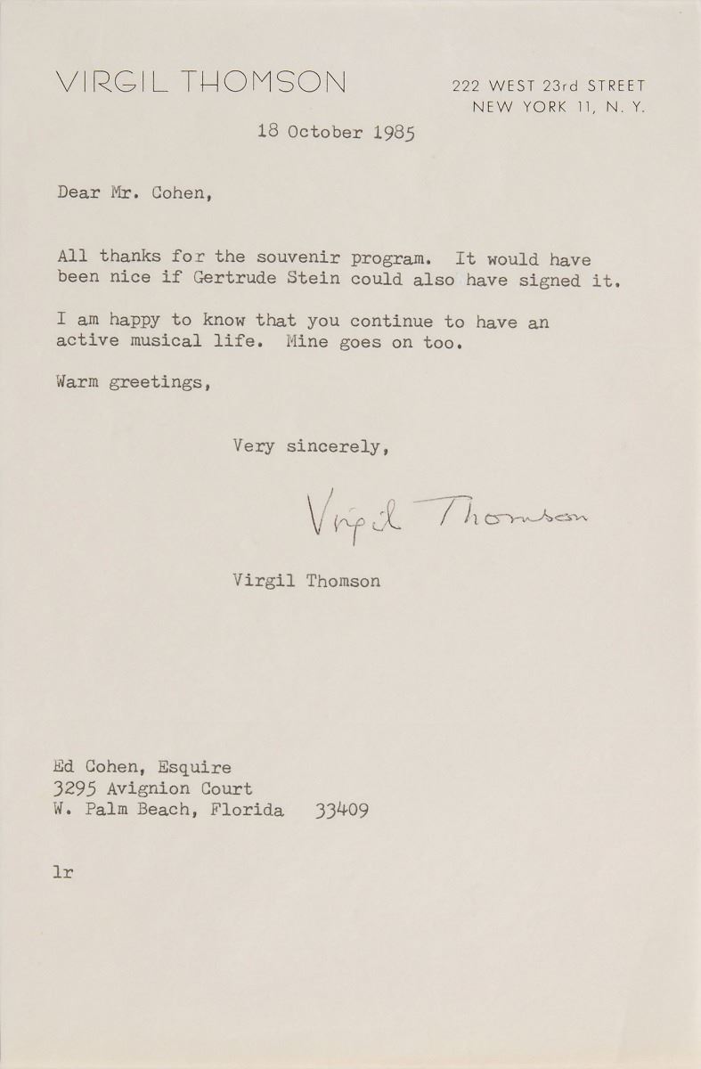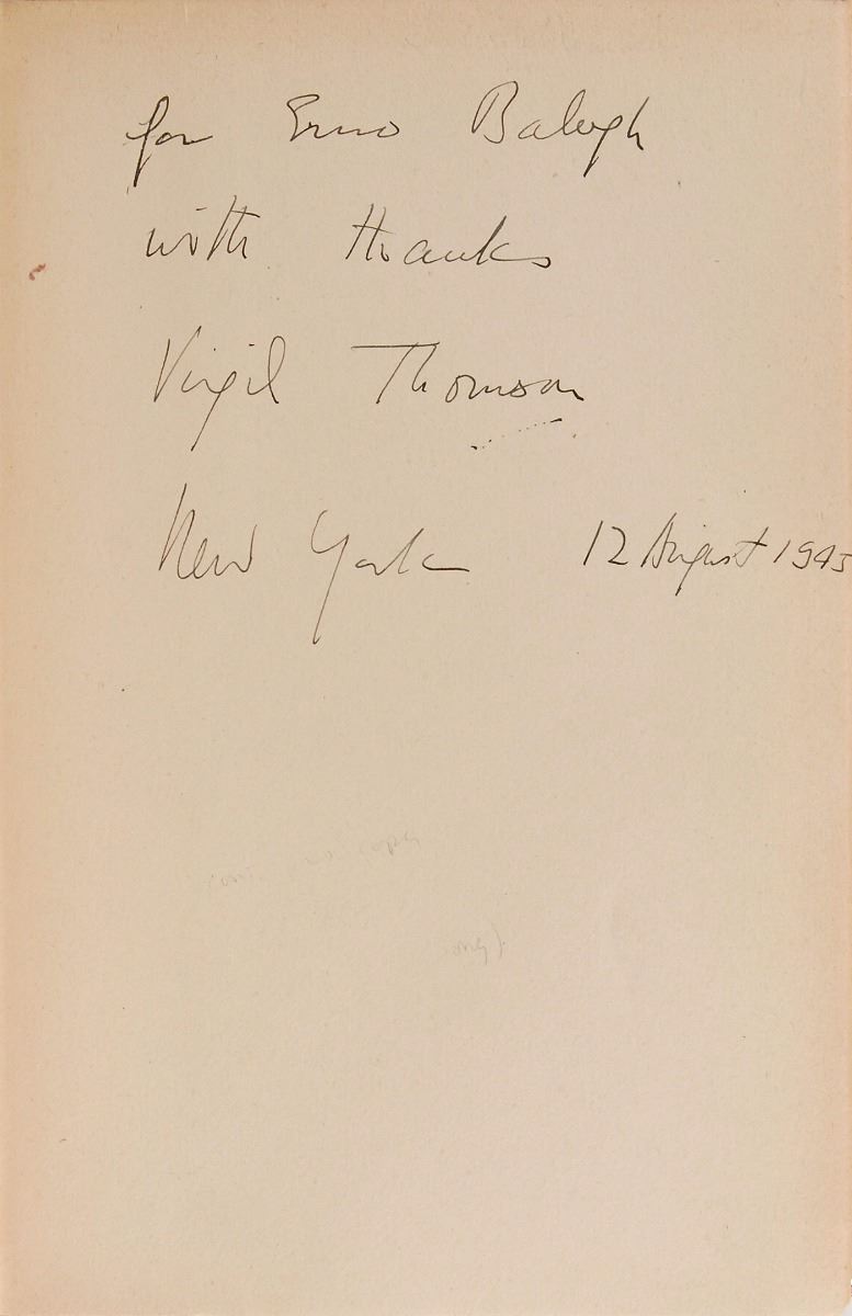 Three items: a program for the 1947 world premiere of The Mother of Us All, six pages, signed and inscribed to fellow composer Edward Cohen by Thomson, and also signed by conductor Otto Luening and most members of the cast; a TLS to Cohen on personal letterhead, one page, October 18, 1985, in part: "Thanks for the souvenir program. It would have been nice if Gertrude Stein could also have signed it"; and a first edition hardcover of The Musical Scene, with dust jacket, signed and inscribed to the composer and pianist Erno Balogh. In overall fine condition. Accompanied by the original mailing envelope for the letter
