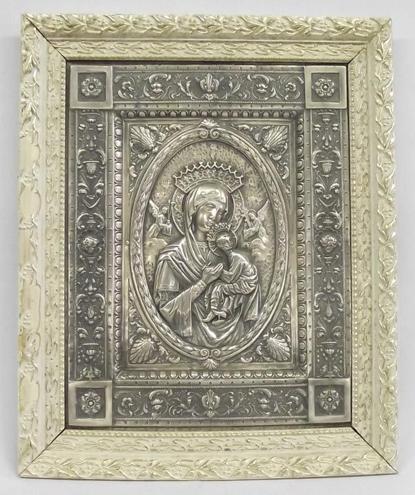 Virgin & Child Icon-Style Metal Relief Plaque. Quite a stunning icon-style plaque of a madonna and child depicting Mary as Queen of Heaven, surrounded by 2 guardian angels. Image size 12'' x 9.5''.