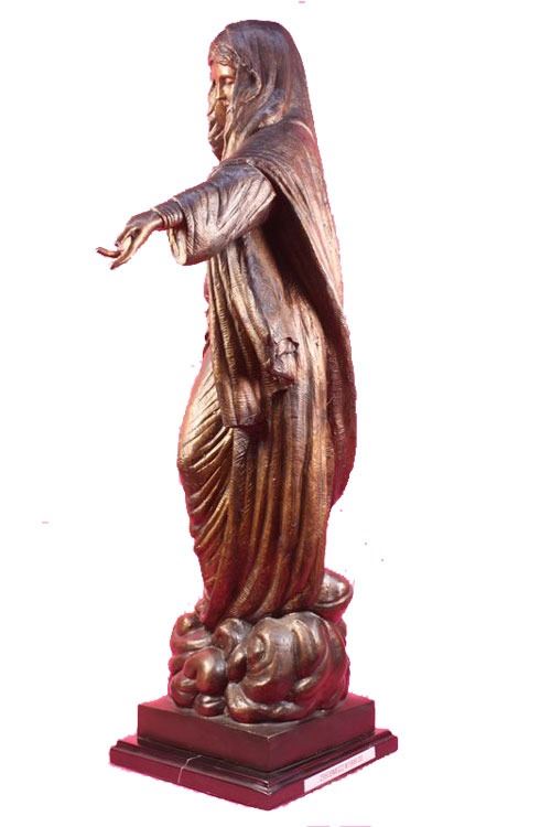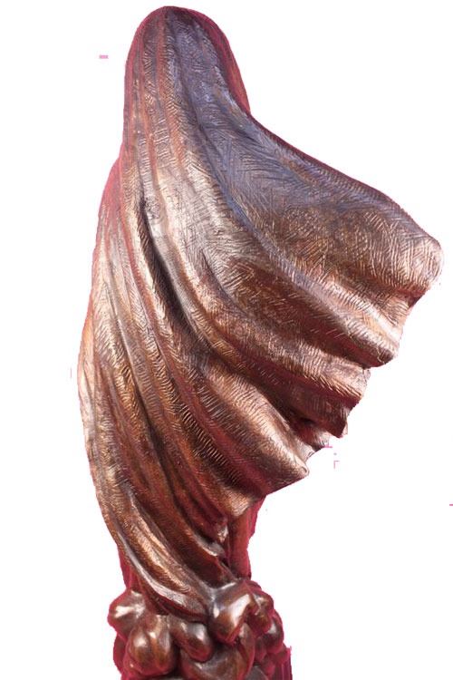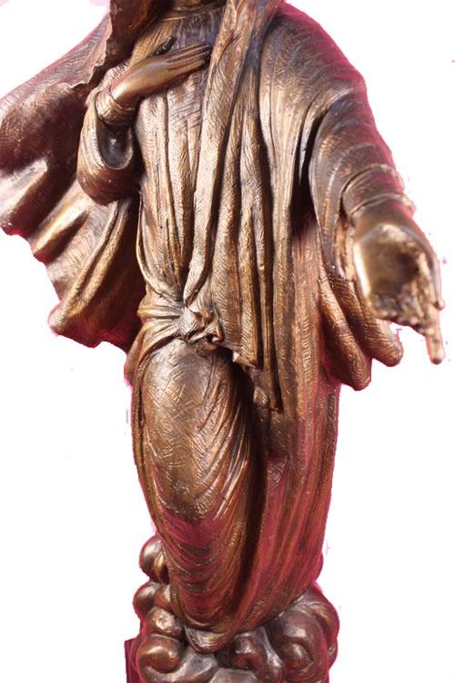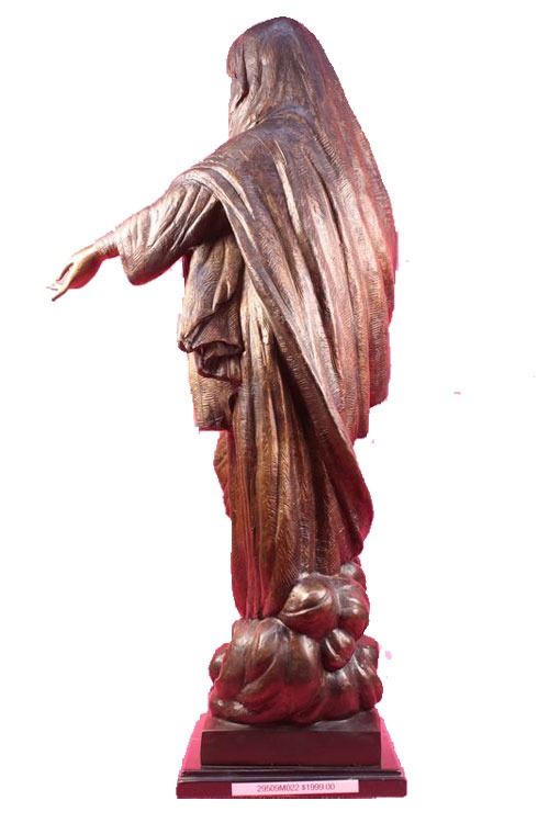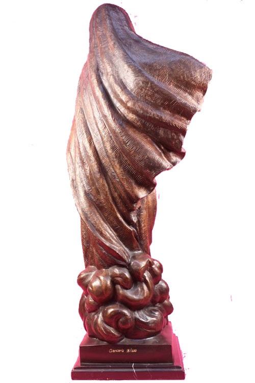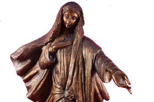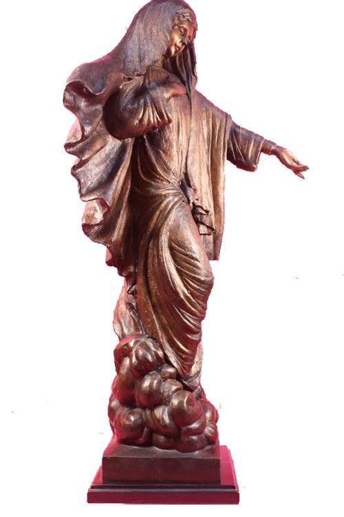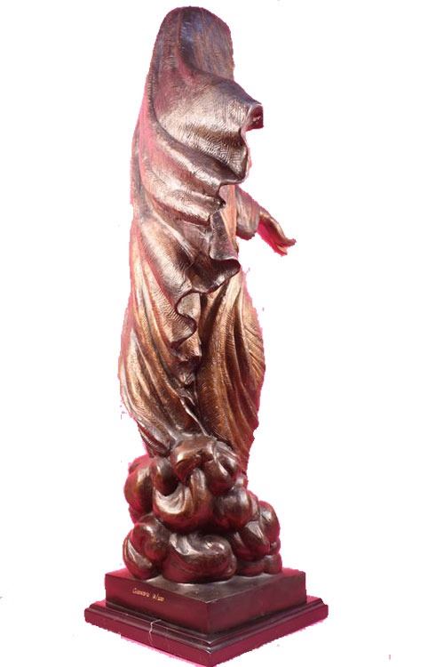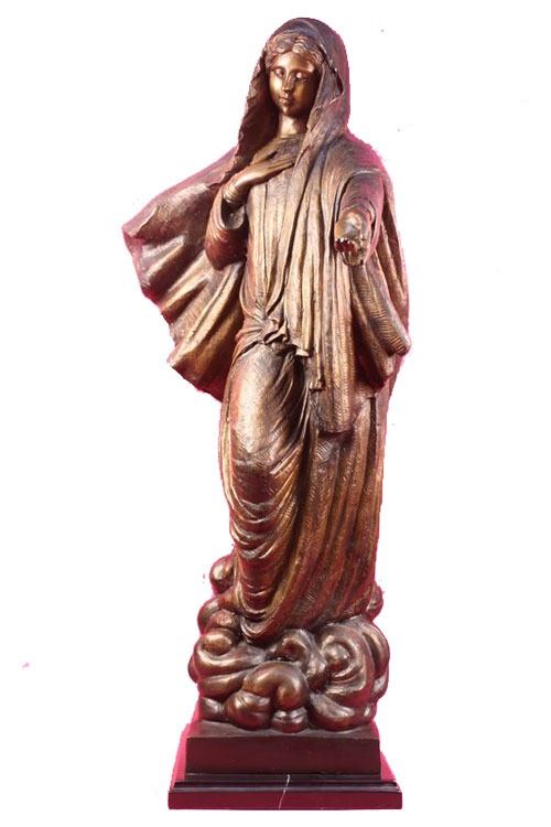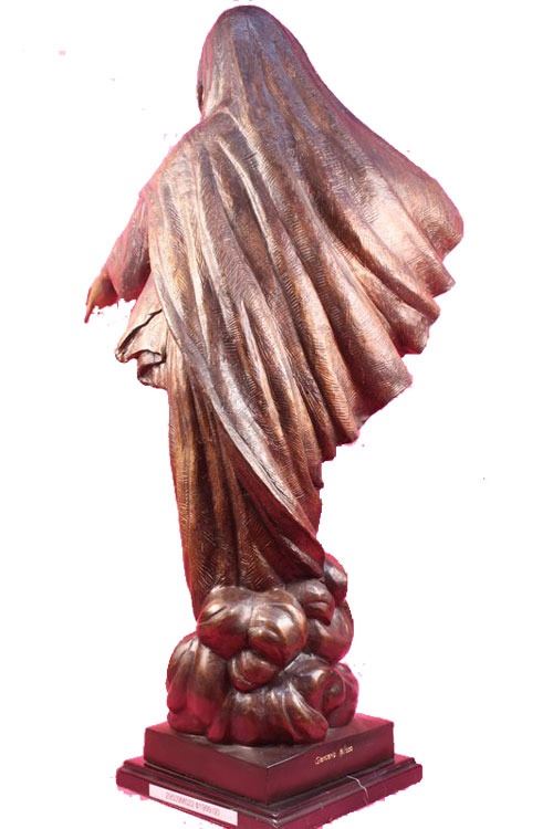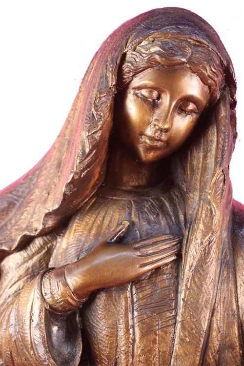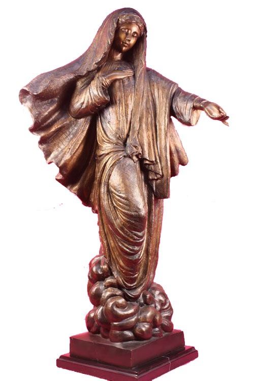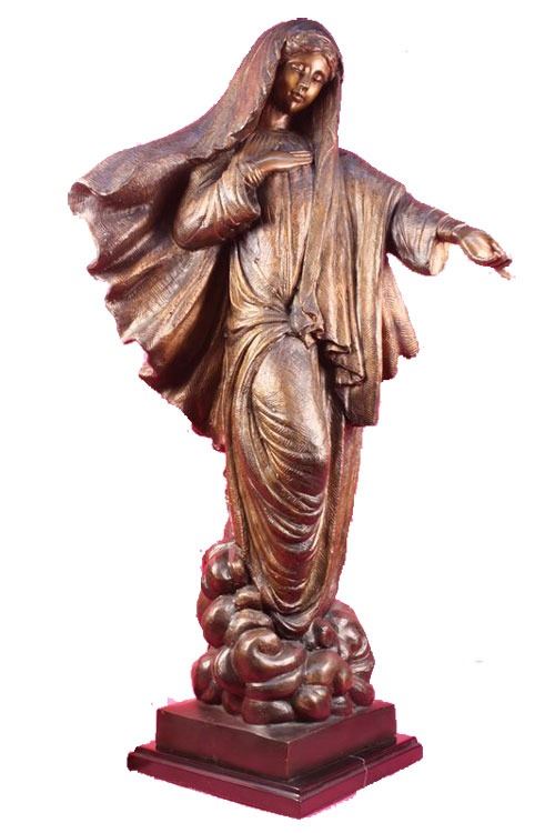 This is a stunning sculpture of the Virgin Mary. She emerges from the clouds and slowly steps through them as they fold into themselves and surround her feet. The wind blows through her heavy garments and causes her head veil to be blown back, revealing her hand that rests gently over her heart. Her other hand reaches forward with her palm facing up, in more of a gesture then an action. Her face is calm and angelic as she closes her eyes and faces downwards. The essence of this sculpture gives one hope, faith, and above all an unconditional love. This sculpture has a two toned brown patina and was cast using the Lost Wax Method. It is mounted on a marble base. Bronze Dimensions with Marble Base: Height 33 X Width 18 inches. Weight: 45 LBS. Inventory: 7022029509M07