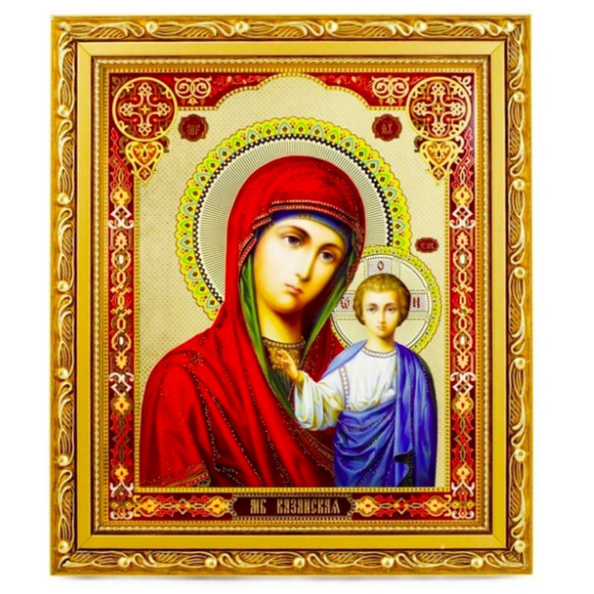 Virgin Mary & Jesus Russian Orthodox Icon. Gilt paperboard with wooden frame. Made by Ukrainian artisan. 9" X 11"Â
