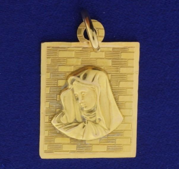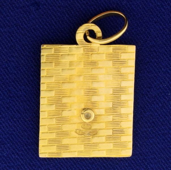 In 18k yellow gold, 1 1/4 inch long and 3/4 inch wide with bale. 4.4g.