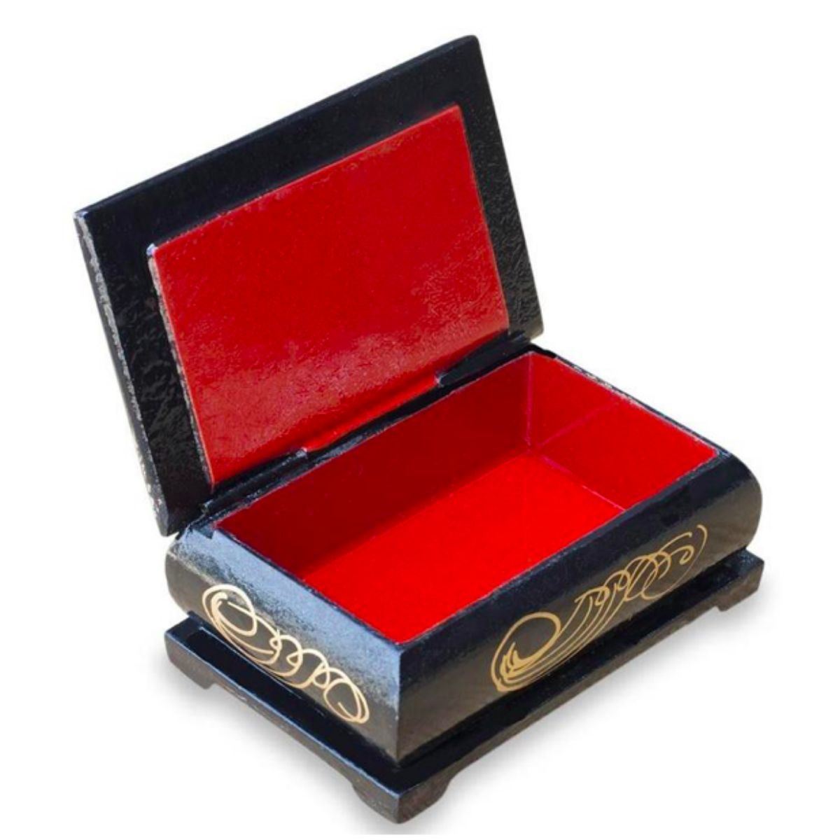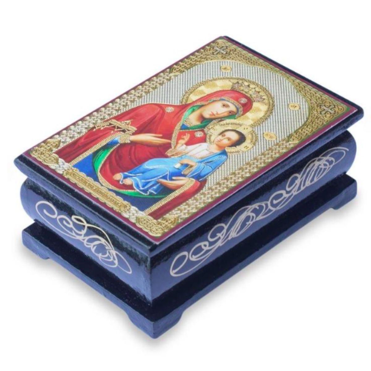 Russian made Virgin Mary & young Jesus wooden icon rosary or trinket box. Hand-painted gold gilt with decoupage over linden wood case. 3 1/2" L X 2 1/4" W X 1 1/2" H.Â