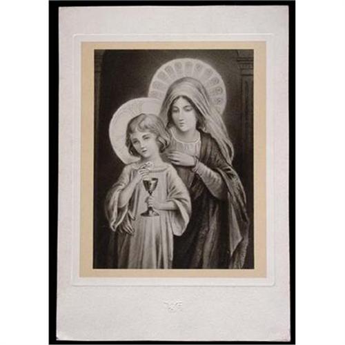 Image of the Madonna and Jesus as a young boy holding a Chalice in one hand and the Communion Host on the other. Print is mounted on a white board with an embossed mark of an angel with the legend: "Bouasse Jeune Paris." In good used condition as shown. Please ask questions, request additional photos and shipping costs before bidding.
