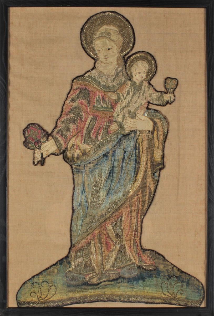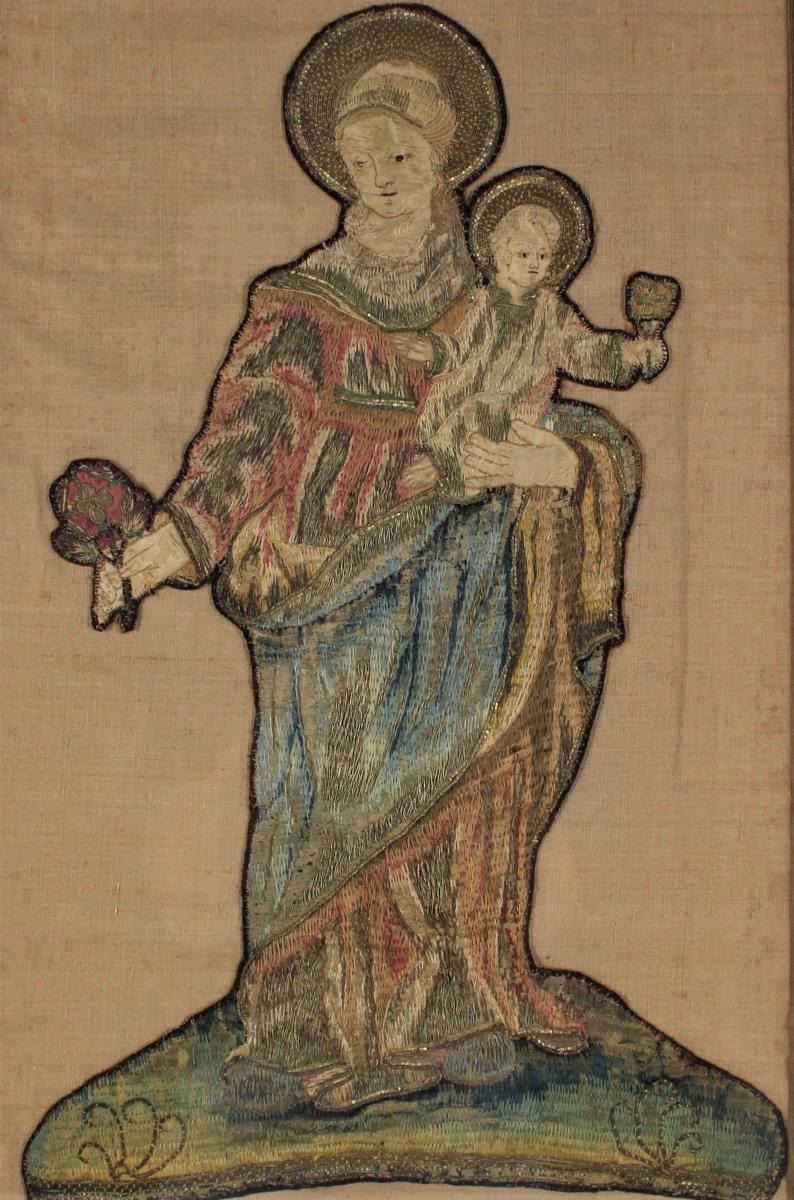 Gilt thread and colored silks in split stitch and couched work on liner.