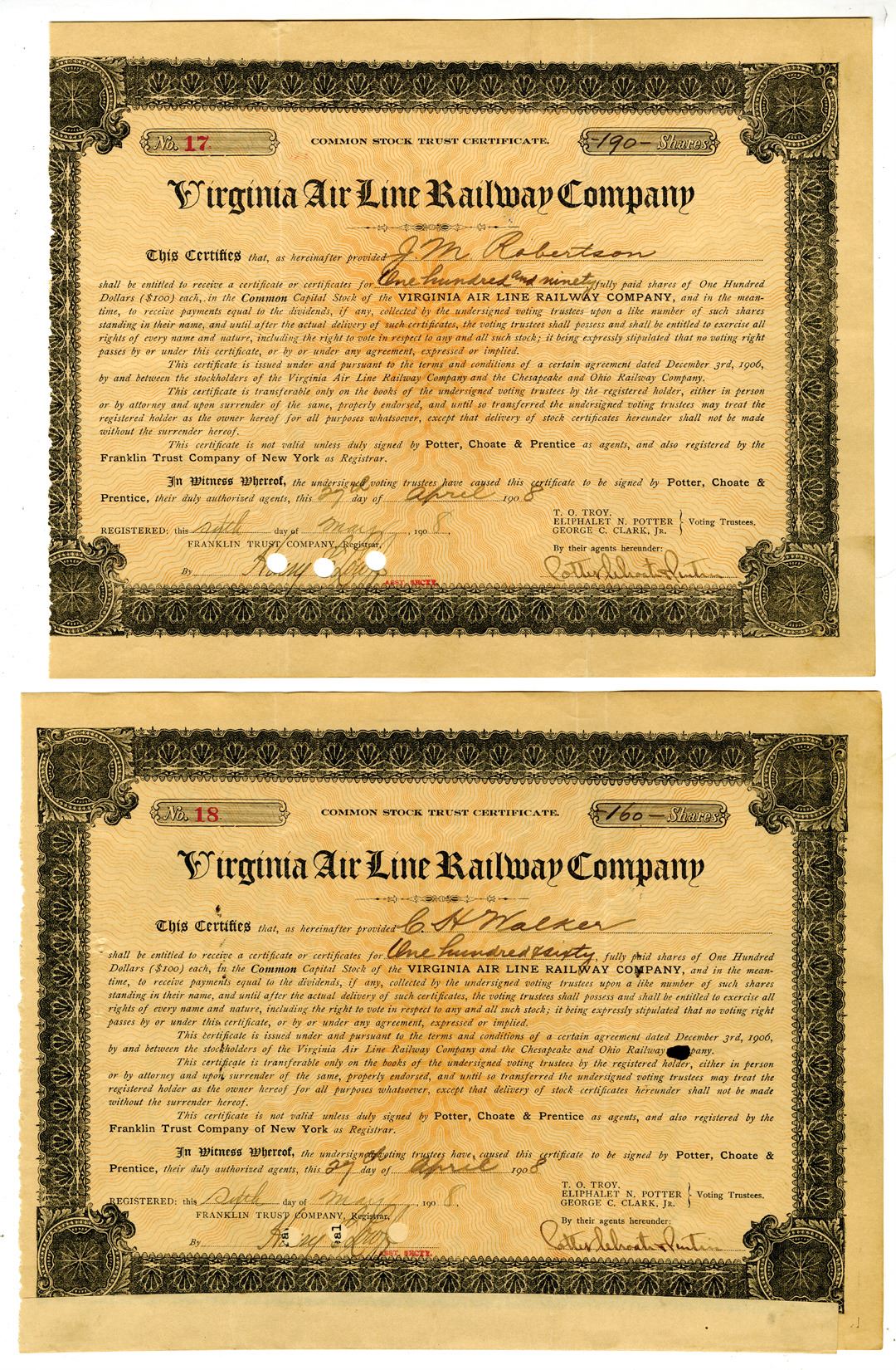 Virginia….., 1908. Lot of 2 I/C Sequential Stock Certificates, Low serial numbers: 17 & 18. Punch out cancelled at bottom, VF-XF condition. (2). Sold "AS IS" no returns accepted.