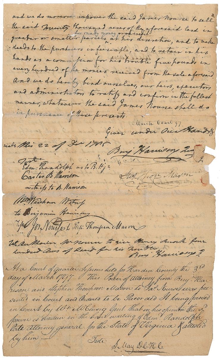 Signer of the Declaration of Independence from Virginia (1726–1791) who was the father of President William Henry Harrison and great-grandfather of President Benjamin Harrison. Manuscript DS, signed twice, “Benj. Harrison,” one page both sides, 7.25 x 12, December 22, 1785. Legal document concerning an agreement between Harrison and others “concerning the purchase and location and surveying of…tracts of land on the western waters,” authorizing an agent to sell up to 20,000 acres of land in the tract. Harrison signs twice at the conclusion, adding an autograph endorsement, “We authorize Mr. Nours to give Henry Smork four hundred acres of land for his trouble.” Also signed by future governor of Virginia Edmund Randolph as a witness. In very good condition, with chipping to edges and archival tape repairs to separations of the intersecting folds. The ‘western waters’ mentioned may be a reference to the Ohio River area, where Harrison was an active land speculator.