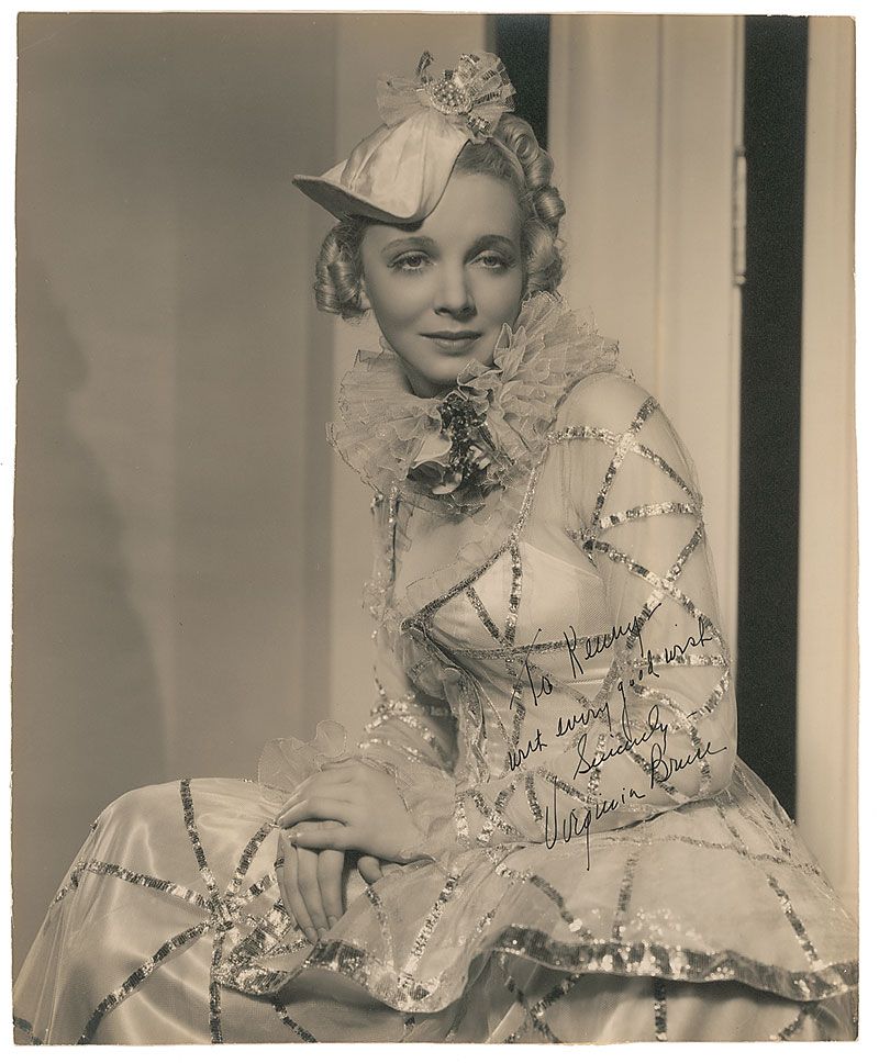 Vintage matte-finish 10.25 x 12.5 photo of Bruce in an elaborate sparkling gown, signed and inscribed in fountain pen, “To Kenny—with every good wish. Sincerely, Virginia Bruce.” In fine condition, with slightly trimmed edges.