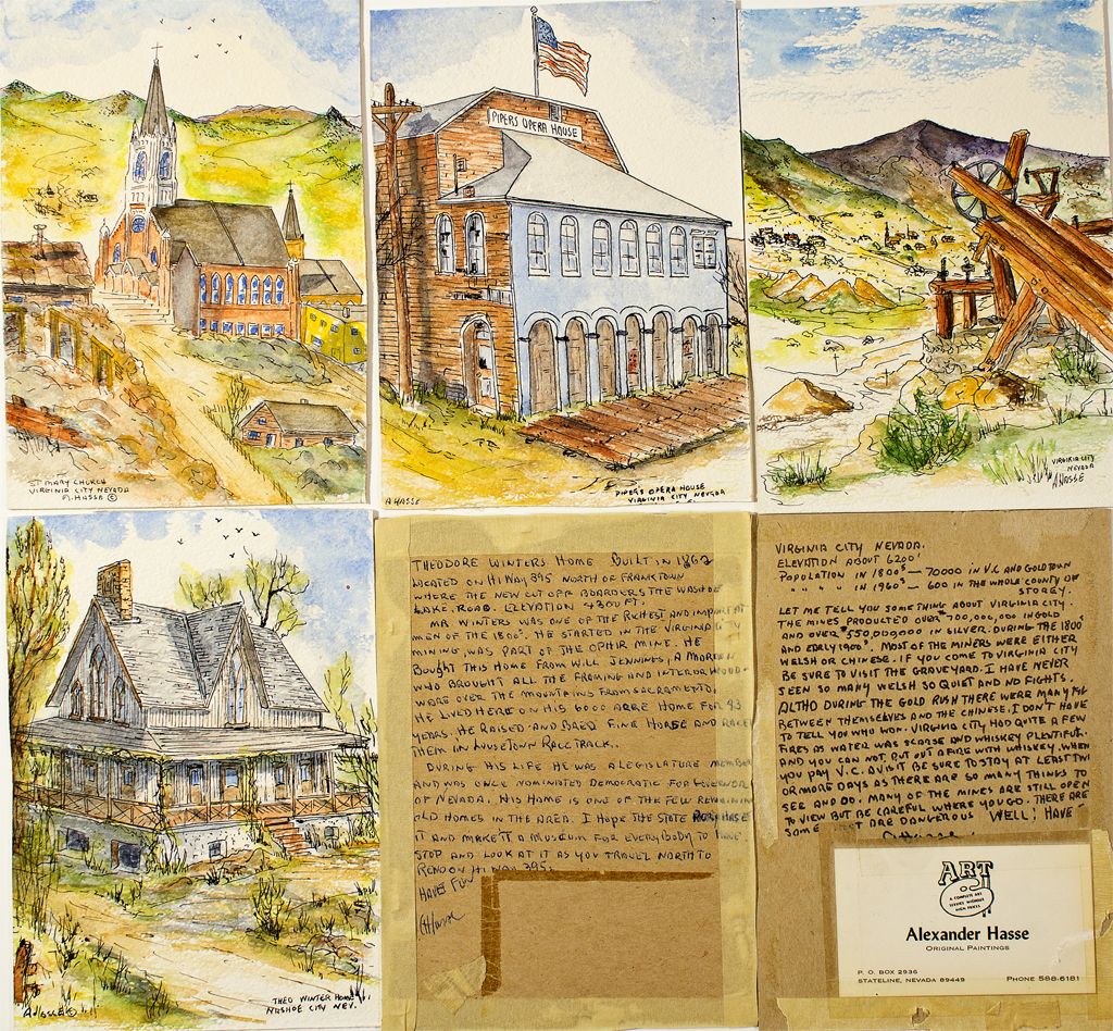 Lot of 4 original colorized pen and ink sketches, done by artist Alexander Hasse of Stateline, Nevada. Each 5x7 inches. Theodore Winters Home, St. Mary`s Church, Piper`s Opera House, and a view of old mining stamp mill. Circa 1960.City: Virginia CityCounty: Storey CountyState: NV