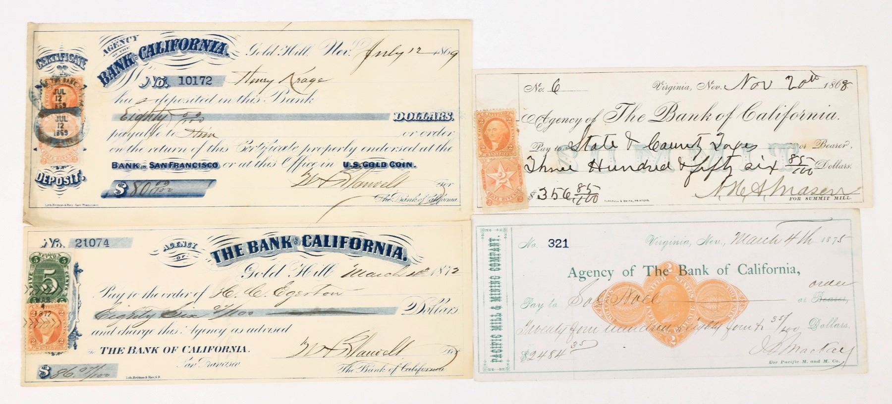 Lot of 4. Includes: two different Gold Hill Bank of California checks/drafts, 1869 and 1872, each with Nevada revenue stamps; Summit Mill, Virginia City, Nevada, 1868, signed by supt. Mason, also with NV adhesive revenue stamp; and Pacific Mill & Mining Company check, RN-D, 1875, signed by John Mackay.