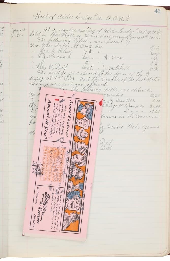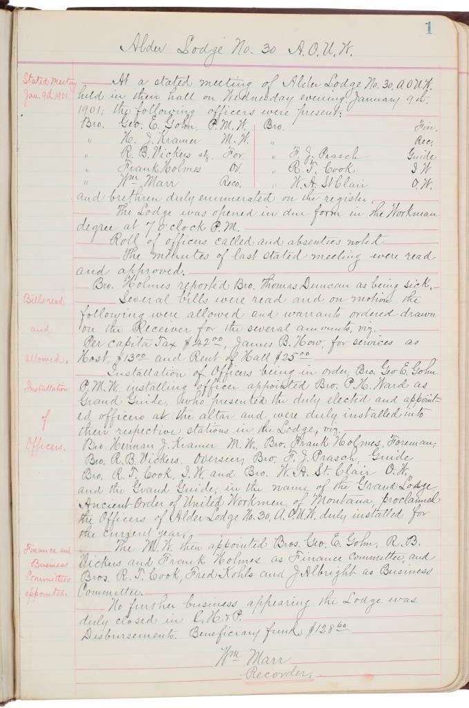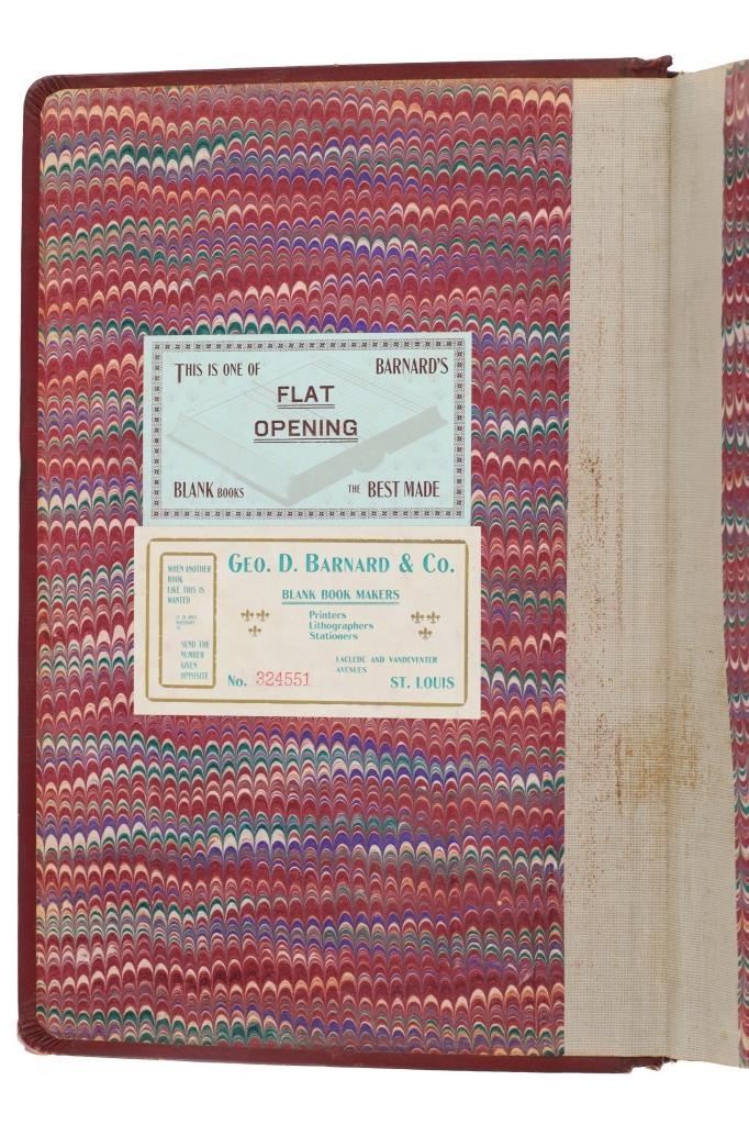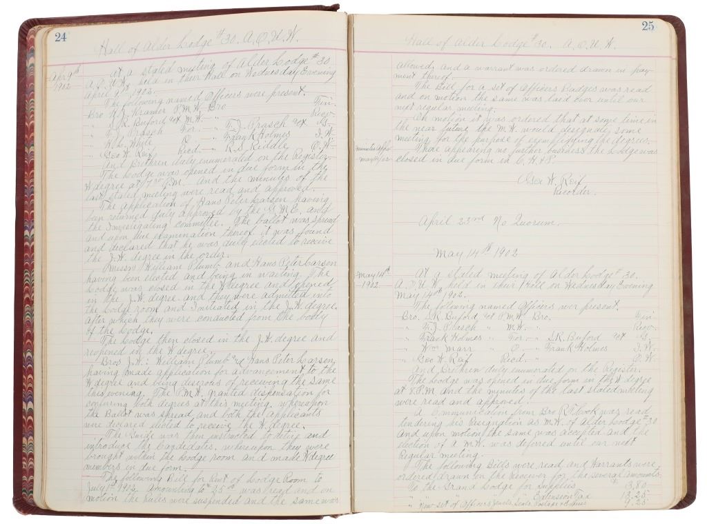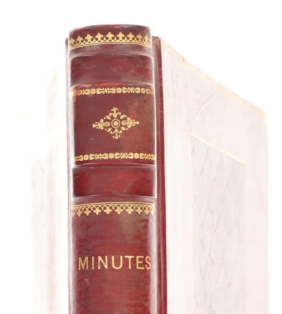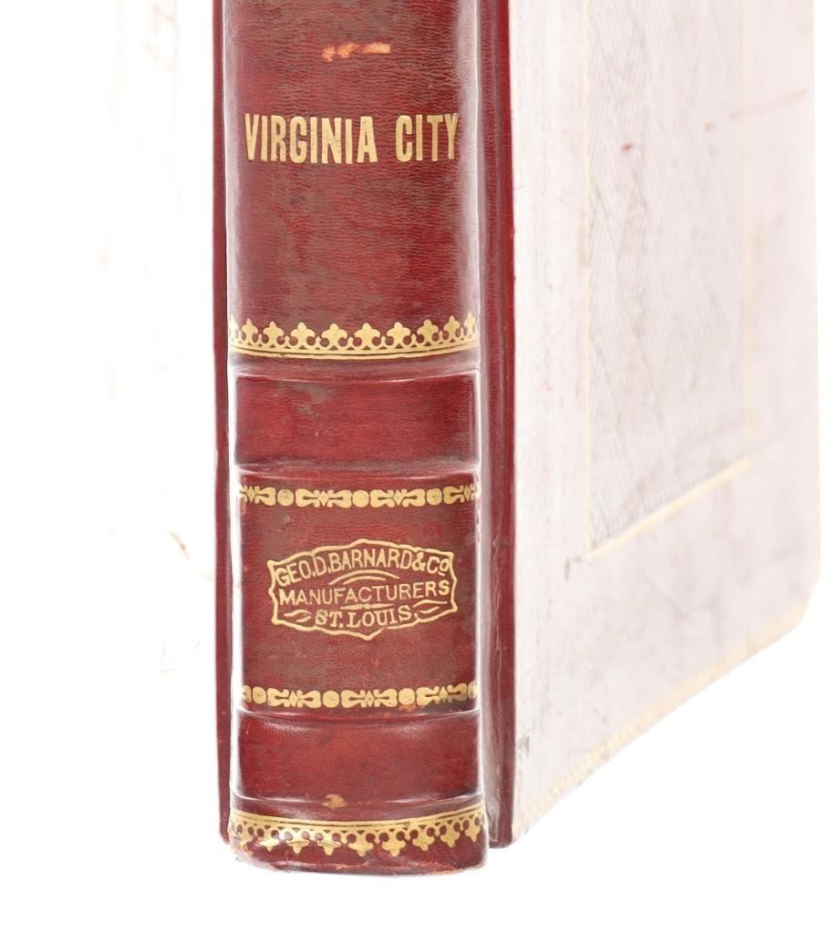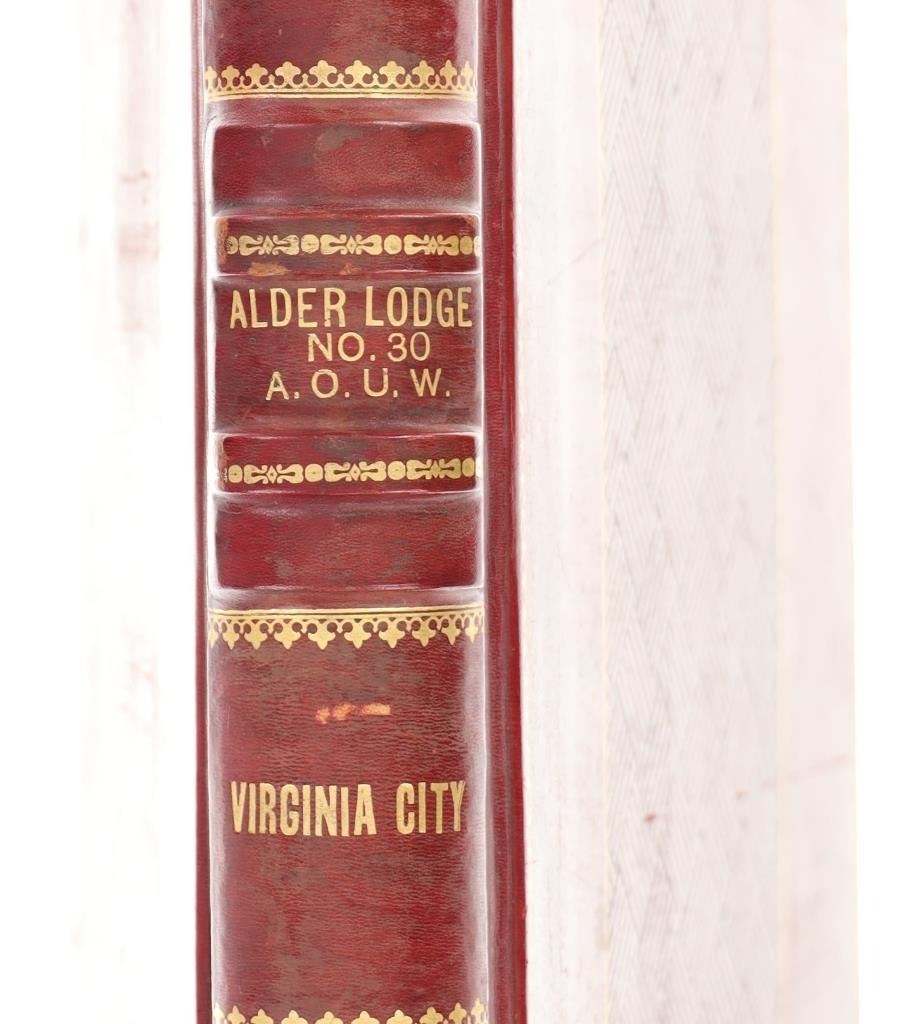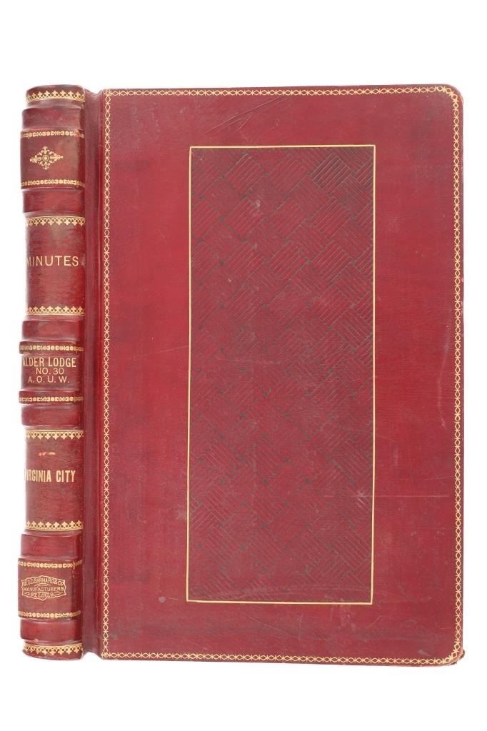 Featured in this lot is this personal ledger book from Virginia City for the Alder Lodge No. 30 circa 1901. The ledger features a wonderfully and professionally crafted leather bound construction with gold gilt designs and lettering covering the front cover and spine of the book. The spine reads, "Minutes / Alder Lodge No. 30 A. O. U. W. / Virginia City / Geo. D. Barnard & co. Manufacturers St. Louis" in gold gilt lettering. The spine features large ribs or hubs which are horizontal bands that are created during the binding process. The shape, number, and thickness of the bands can indicate the age of the binding. The first 43 interior pages are filled with writing but the rest of the ledger book is empty. The book shows good condition overall with some wear to the spine and corners of the front cover, but no signs of obvious damage is noted. The book measures 16" L x 11 1/2" W x 1 3/4" D.