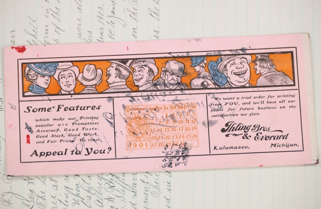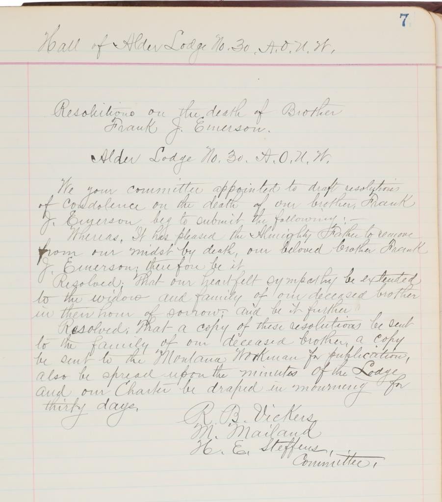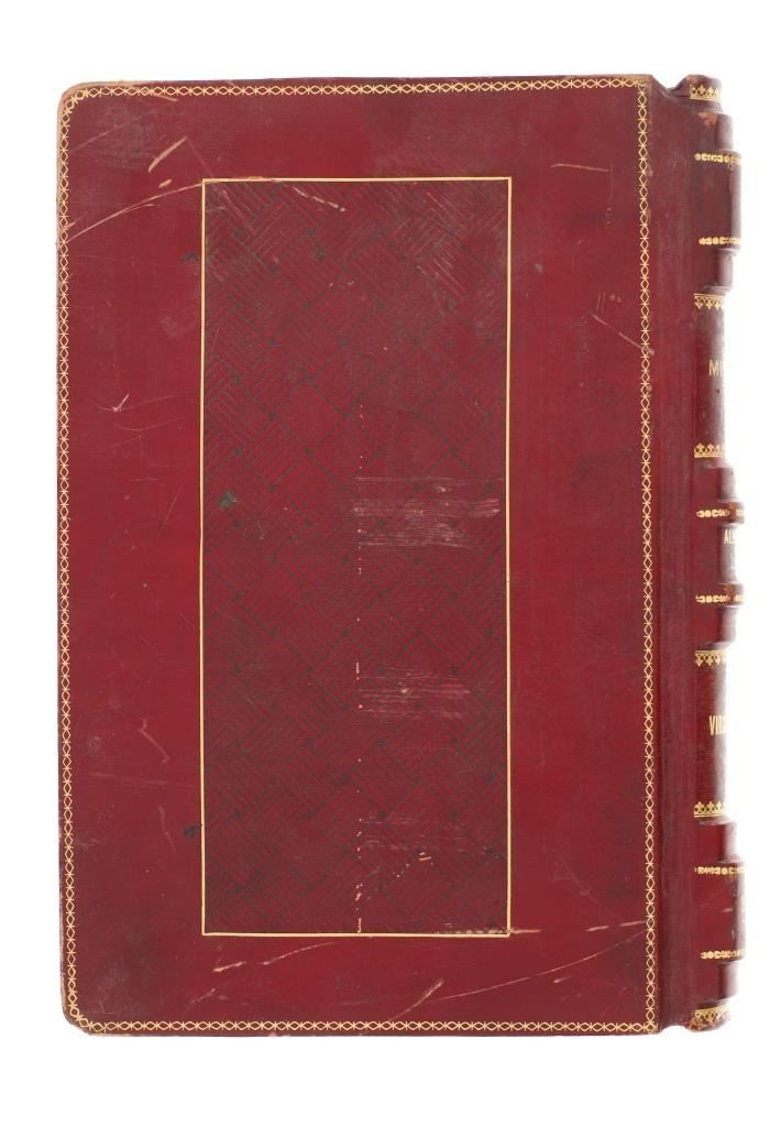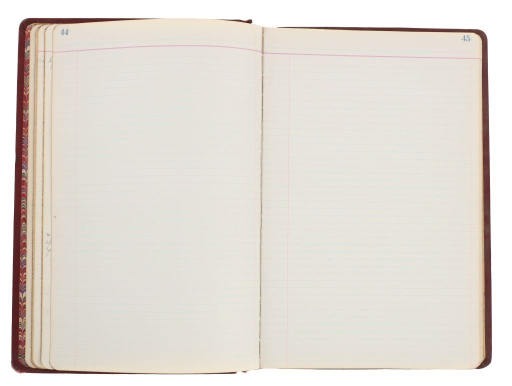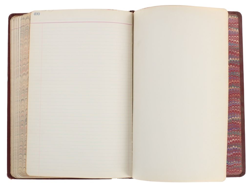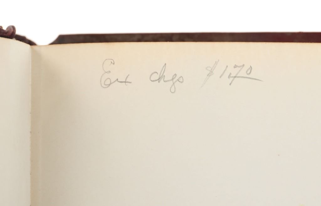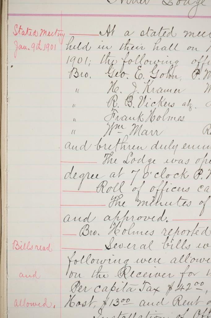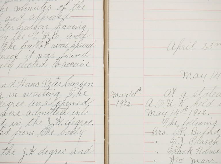 Featured in this lot is this personal ledger book from Virginia City for the Alder Lodge No. 30 circa 1901. The ledger features a wonderfully and professionally crafted leather bound construction with gold gilt designs and lettering covering the front cover and spine of the book. The spine reads, "Minutes / Alder Lodge No. 30 A. O. U. W. / Virginia City / Geo. D. Barnard & co. Manufacturers St. Louis" in gold gilt lettering. The spine features large ribs or hubs which are horizontal bands that are created during the binding process. The shape, number, and thickness of the bands can indicate the age of the binding. The first 43 interior pages are filled with writing but the rest of the ledger book is empty. The book shows good condition overall with some wear to the spine and corners of the front cover, but no signs of obvious damage is noted. The book measures 16" L x 11 1/2" W x 1 3/4" D.