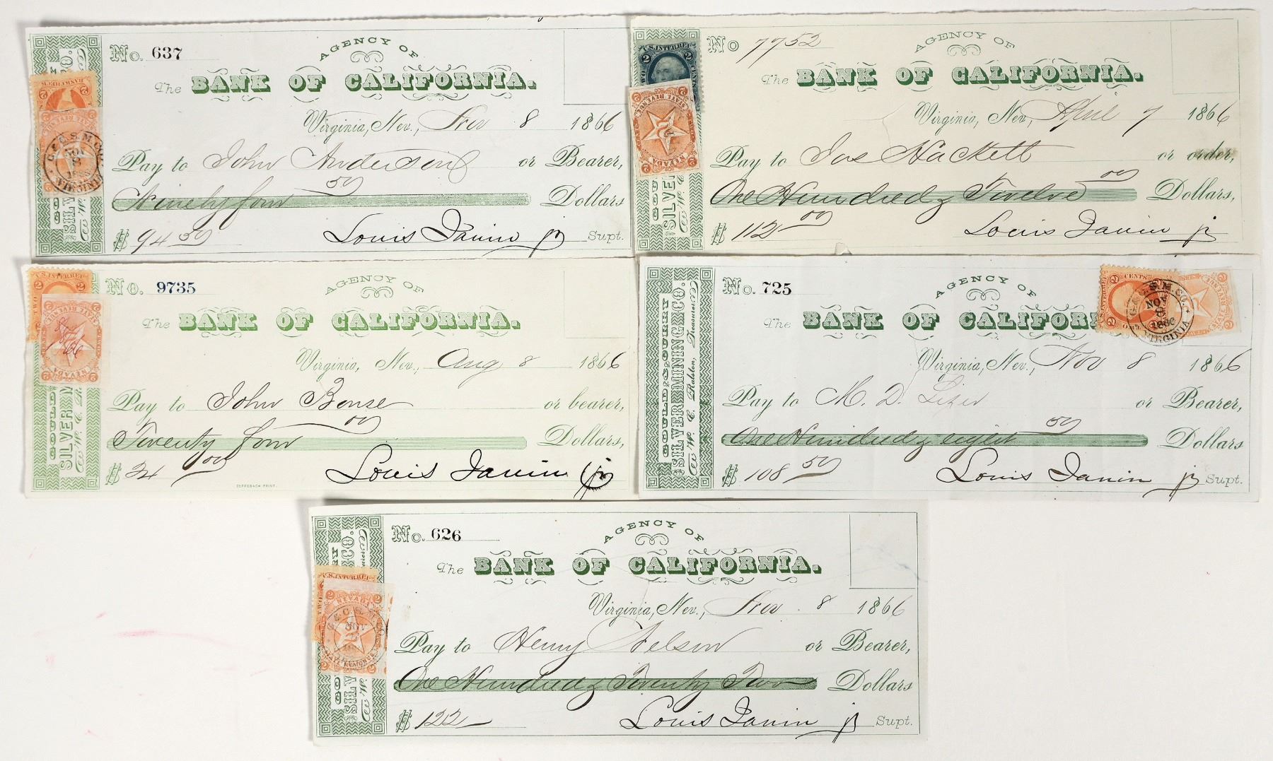 Lot of 5 with cancel varieties. Includes: left side application, upside down, strong cancel; check with blue federal stamp; check with red ink cancel; right side application with strong cancel; and left side application, regular. All signed by Louis Janin as supt.
