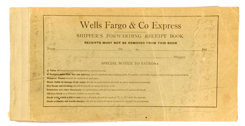 Original receipt book, about 5 x 9", app. 50pp, for packages shipped. The WF agent Mr. Henry signed for the packages at right. The destination cities are generally all in western Nevada. Several pages have revenue stamps adhered (possibly R196). Only 3pp of the entire book are used. The city of origin is a guess.