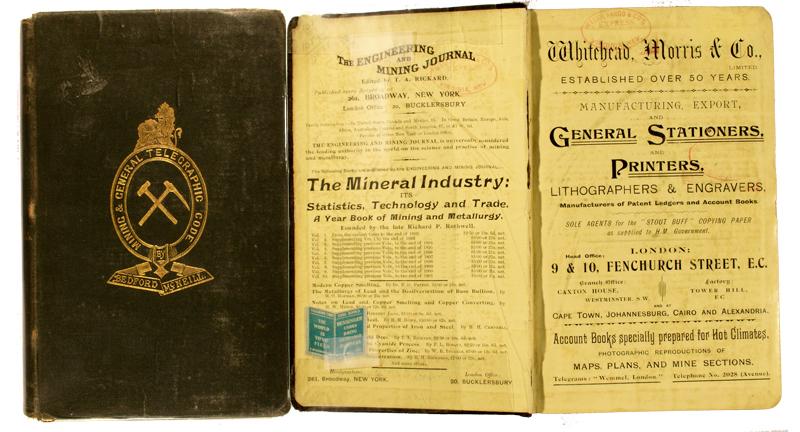 Original copy of McNeill's book Mining and General Telegraphic code, undated, but c1875, printed by Whitehead, Morris & Co. London, 807pp plus avertisement pages. The book contains the hand stamp of the Wells Fargo Express Office of Virginia City in the front and back. This classic volume contains both the words, phrases and code words used for telegraphic transmission of secret messages. It is arranged in alphabetical order so the reader can look up the code words of a telegram. This copy was distributed (sold) by Bensinger Co. in New York. It was used by mine managers, stock brokers, banks, express companies and others who needed secret or private communication.