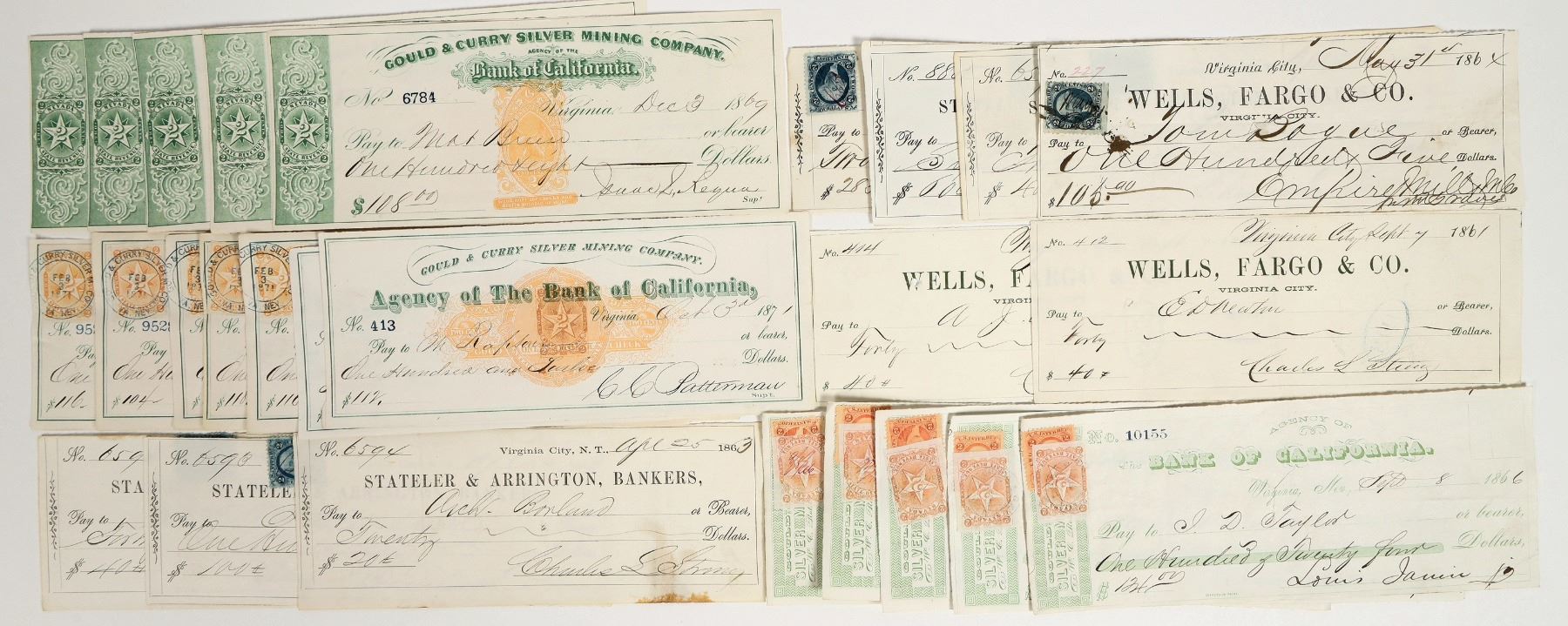 Lot of 26. Mostly Gould & Curry. Includes: rare 1872 with RN-B17b, signed by CC Batterman; rare 1871 with RN-C21b, signed by Batterman; 5 RN-B plus green printed NV, signed by Requa, 1869; 5 RN-C plus tied NV orange adhesive, 1871, signed by CC Batterman; two 1861 Wells Fargo signed by Charles Strong for the Gould & Curry; 5 Bank of Cal. G&C signed by Janin, 1866, with NV and US IR stamps; 1864 Wells Fargo signed by RN Graves for the Empire Mill & Mining Co.; and six Stateler & Arrington territorial checks, 1863-64, signed by Charles Strong or Charles Bonner for the G&C, one with red cancel.