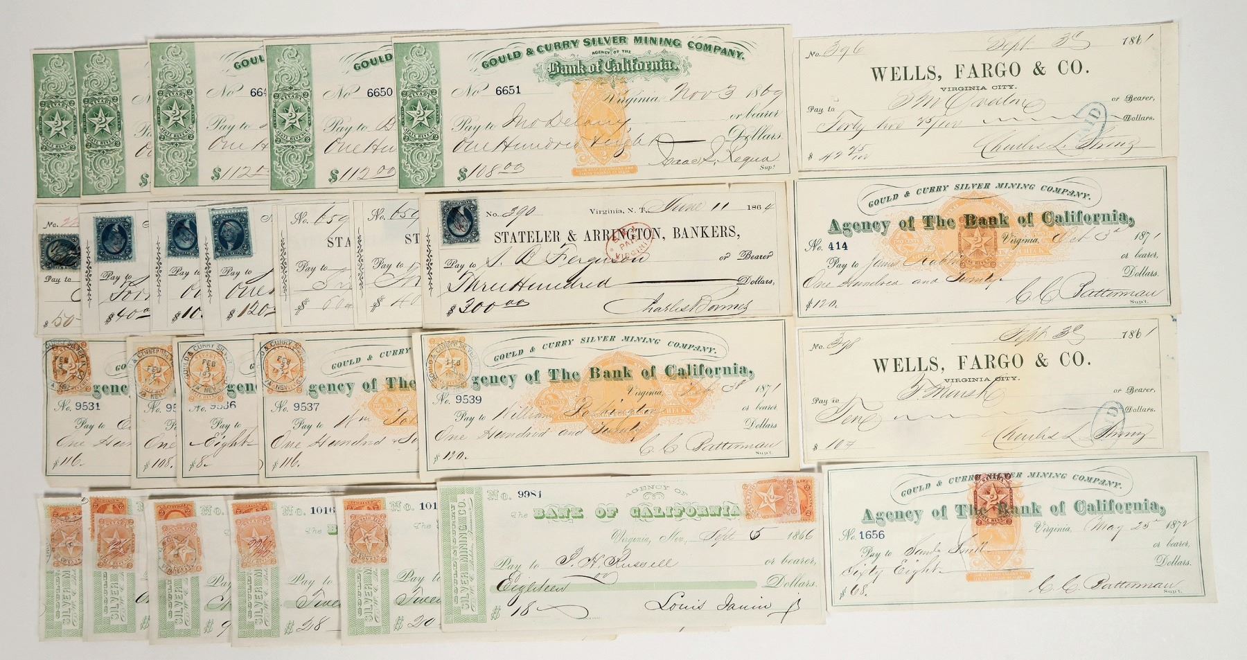Lot of 26. Mostly Gould & Curry. Includes: rare 1872 with RN-B17b, signed by CC Batterman; rare 1871 with RN-C21b, signed by Batterman; 5 RN-B plus green printed NV, signed by Requa, 1869; 5 RN-C plus tied NV orange adhesive, 1871, signed by CC Batterman; two 1861 Wells Fargo signed by Charles Strong for the Gould & Curry; 5 Bank of Cal. G&C signed by Janin, 1866, with NV and US IR stamps; 1864 Wells Fargo signed by RN Graves for the Empire Mill & Mining Co.; and six Stateler & Arrington territorial checks, 1863-64, signed by Charles Strong or Charles Bonner for the G&C, one with red cancel.