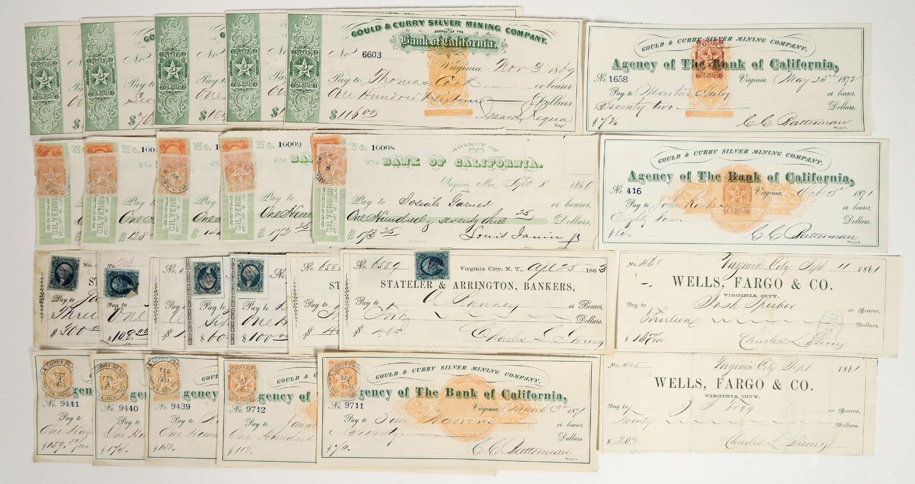 Lot of 26. Mostly Gould & Curry. Includes: rare 1872 with RN-B17b, signed by CC Batterman; rare 1871 with RN-C21b, signed by Batterman; 5 RN-B plus green printed NV, signed by Requa, 1869; 5 RN-C plus tied NV orange adhesive, 1871, signed by CC Batterman; two 1861 Wells Fargo signed by Charles Strong for the Gould & Curry; 5 Bank of Cal. G&C signed by Janin, 1866, with NV and US IR stamps; 1863 Wells Fargo signed by RN Graves for the Empire Mill & Mining Co.; and six Stateler & Arrington territorial checks, 1863-64, signed by Charles Strong or Charles Bonner for the G&C, one with red cancel.