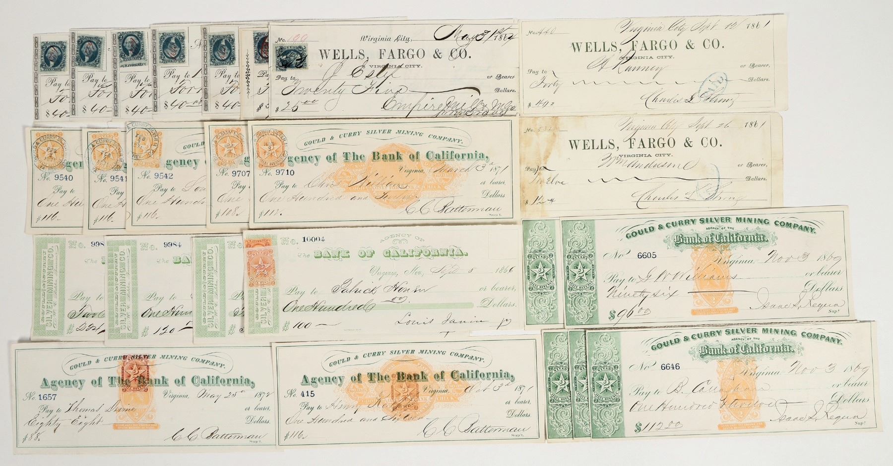 Lot of 26. Mostly Gould & Curry. Includes: rare 1872 with RN-B17b, signed by CC Batterman; rare 1871 with RN-C21b, signed by Batterman; 5 RN-B plus green printed NV, signed by Requa, 1869; 5 RN-C plus tied NV orange adhesive, 1871, signed by CC Batterman; two 1861 Wells Fargo signed by Charles Strong for the Gould & Curry; 5 Bank of Cal. G&C signed by Janin, 1866, with NV and US IR stamps; 1864 Wells Fargo signed by RN Graves for the Empire Mill & Mining Co.; and six Stateler & Arrington territorial checks, 1864, signed by Charles Strong or Charles Bonner for the G&C, one with red cancel.