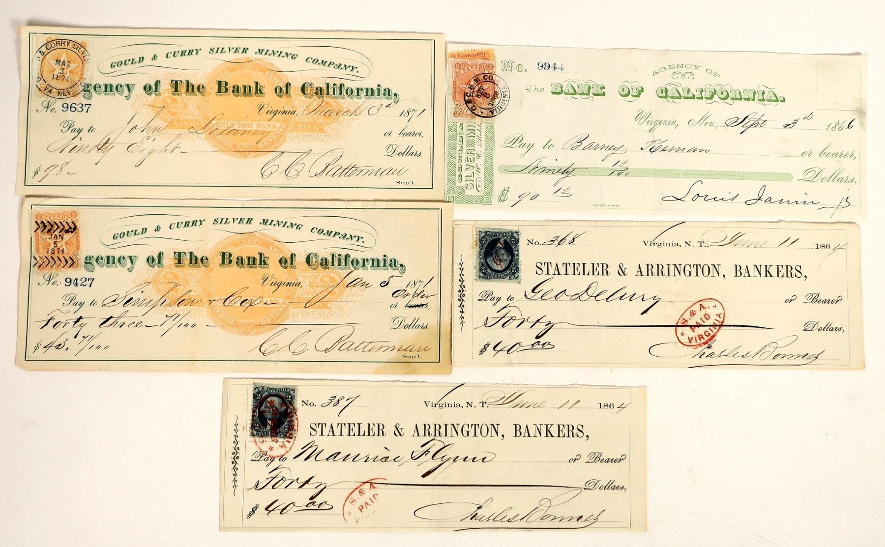 Lot of 5. All of these checks have different cancels. Includes: 1864 Stateler & Arrington territorial with red cancels over US IR stamp; 1864 S&A with red cancel not on stamp; 1866 Bank of California with bold tied G&C cancel over NV adhesive; 1871 G&C with different tied cancel over NV adhesive; and 1871 G&C with unusual double arrow cancel on NV adhesive.