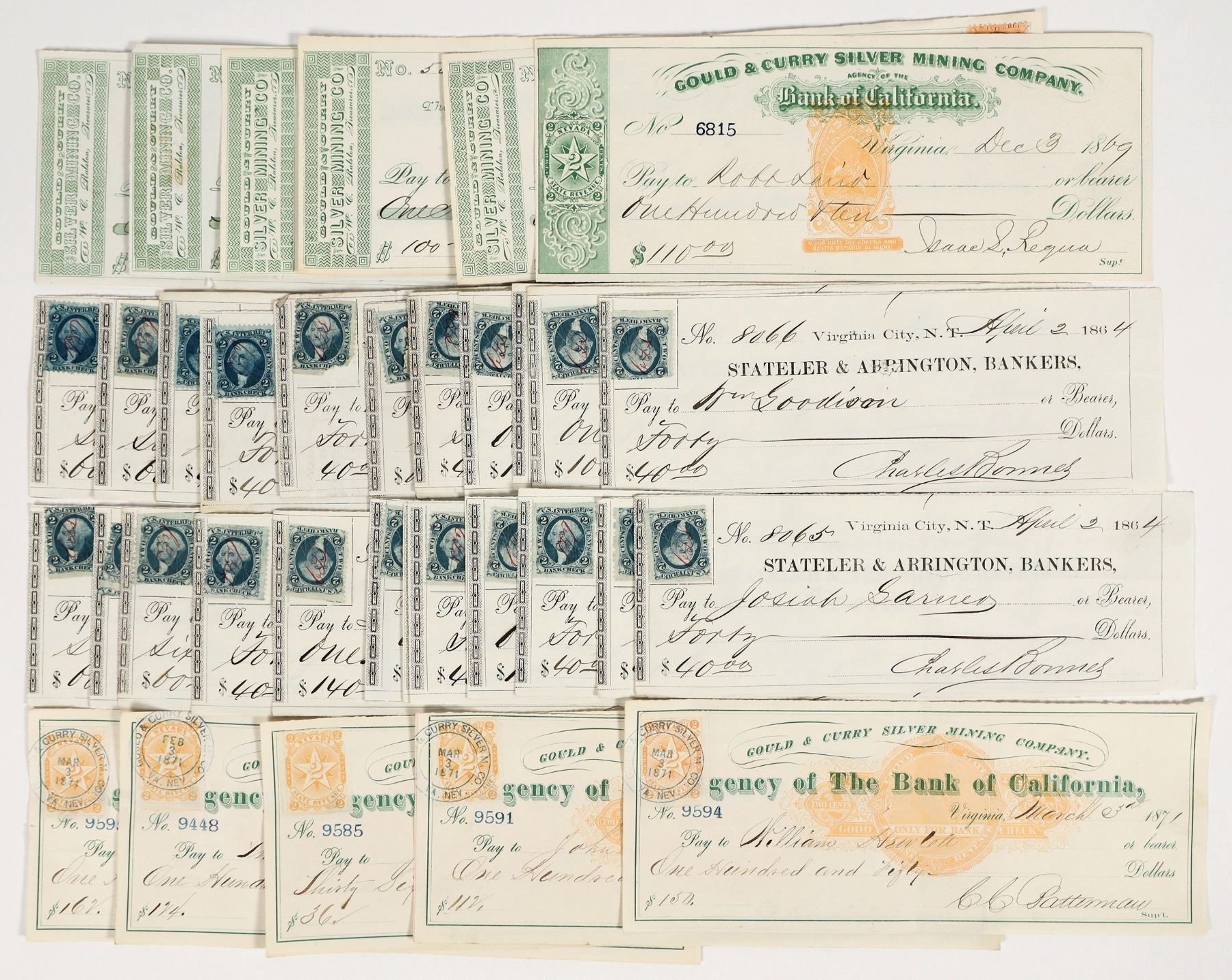 Lot of 36. Instant collection! Four different superintendents. 1) Twenty-five Stateler & Arrington territorial checks issued in 1864. Signed by Charles Bonner as supt. Charles Strong was replaced by Charles Bonner for his management of the expensive company mill. He later took his own life. Likely most issued to mine or mill workers for the Gould & Curry. 2) Five Bank of California checks issued 1865-67, signed by Louis Janin Jr. as supt. Three with US IR stamps. 3) 1869 Bank of California check with RN-B and green printed NV revenue stamp in border. Signed by Isaac Requa. 4) Five Bank of California checks with RN-C and orange NV adhesive revenue stamps. Signed by CC Batterman as supt. in 1871. Four with tied cancels.