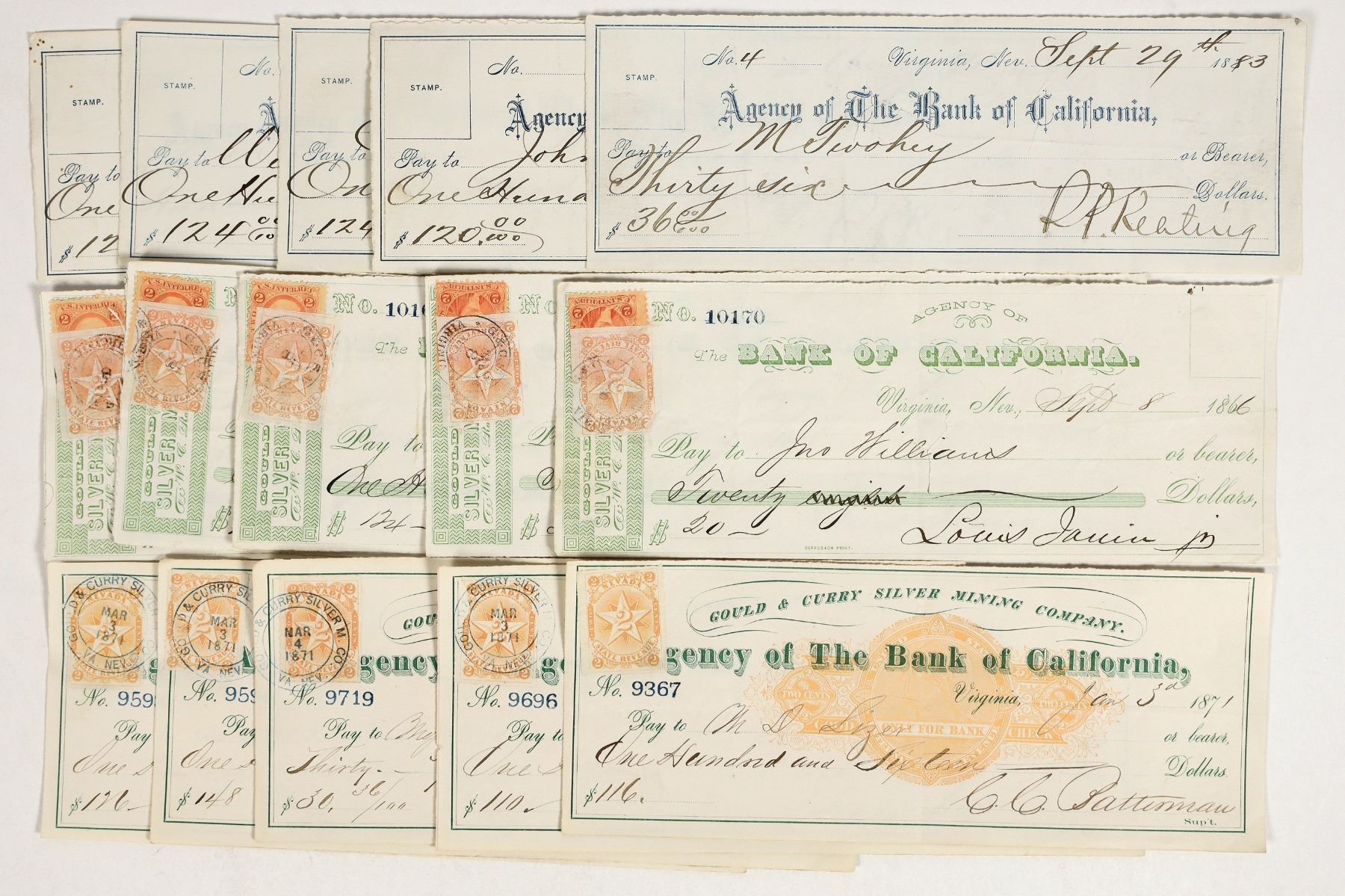 Lot of 15. Five each of three different check types. Great resale lot! 1) Five 1866 checks, Gould & Curry, signed by Louis Janin Jr. as supt. All with NV and US IR adhesive stamps. 2) Five 1871 Gould & Curry checks signed by CC Batterman as supt. All with RN-C imprinted revenue and orange NV adhesive revenue stamps. 3) Five 1883 Bank of California checks signed by RP Keating. Keating was involved in numerous Comstock mines. These are possibly for the Savage Mine.