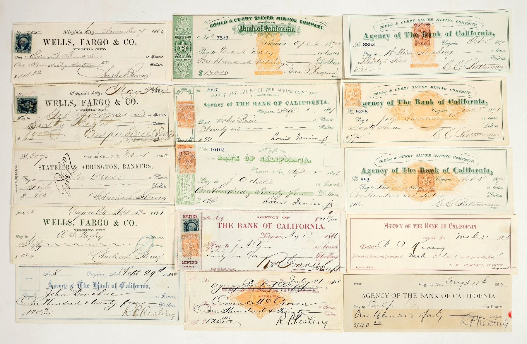 Lot of 15. Excellent representative group from this larger Comstock archive! Includes: 1861 Wells Fargo signed by Charles Strong for Gould & Curry; 1862 Stateler & Arrington signed by Strong for G& C;1864 Wells Fargo signed by RN Graves for Empire Mill & Mining Co.; 1864 Wells Fargo signed by Charles Bonner for G& C; 1866 Bank of Cal. signed by Graves for Empire;1866 Bank of Cal. G&C signed by Louis Janin Jr.; 1867 Bank of Cal. G&C "dripping letters" signed by Janin; 1870 G&C with rare RN-B17b, signed by CC Batterman; 1870 G&C with RN-B and green NV printed signed by Requa; 1871 G&C with RN-C and orange NV adhesive signed by Batterman;1872 G&C with rare RN-C21b, signed by Batterman; and three 1880s checks signed by RP Keating for the Savage Mine, one with RN-G. Instant collection!