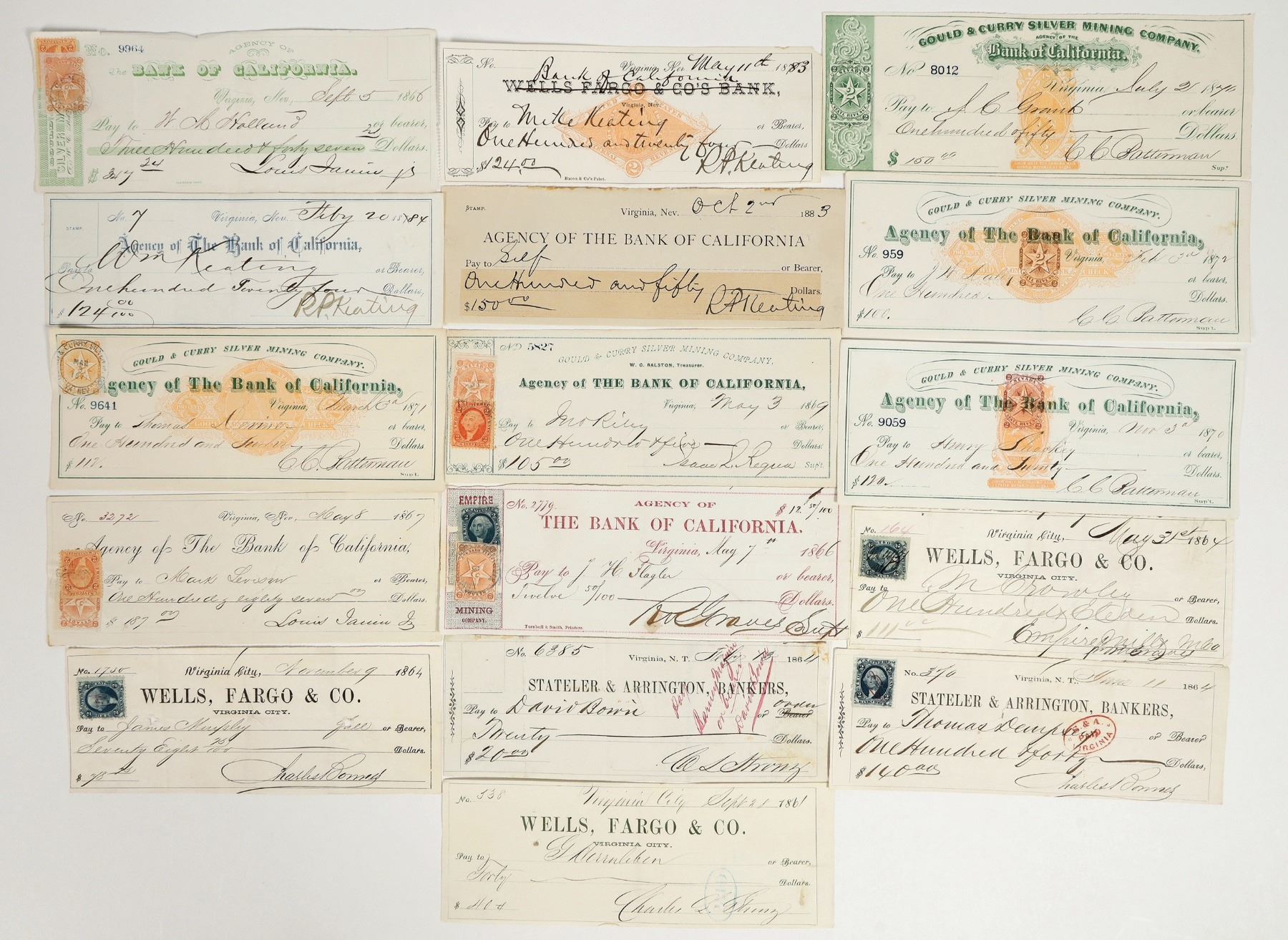 Lot of 16. Great cross section of this Comstock check collection. Most are Gould & Curry related. Includes: 1861 Wells Fargo G&C signed by Charles Strong; 1864 Stateler & Arrington G&C w/red cancel signed by Charles Bonner; 1864 Wells Fargo G&C signed by Bonner; 1864 Stateler & Arrington G&C signed by Strong; 1864 Wells Fargo Empire Mill & Mining signed by RN Graves; 1870 G&C with rare RN-B17b signed by CC Batterman; 1872 G&C with RN-C21b signed by Batterman; 1870 G&C with RN-B signed by Batterman; 1867 signed by Louis Janin; 1866 Empire Mine signed by Graves; 1869 G&C "dripping letters" signed by Isaac Requa; three 1880s checks signed by RP Keating; and more. Please inspect.