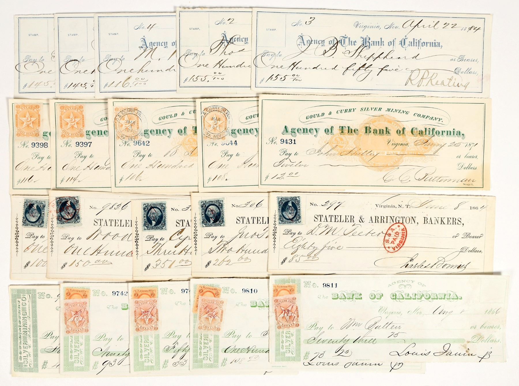Lot of 20, four different types, 5 each. 1-5) Stateler & Arrington territorial checks issued in 1864 for the Gould & Curry Mine. All with rare red bank cancel, signed by Charles Bonner. 6-10) Five Bank of California G&C checks issued in 1866, signed by Louis Janin, all with NV and US IR adhesive revenue stamps. 11-15) Five Bank of California Gould & Curry Mining Co. checks issued in 1871 with RN-C and orange NV adhesive stamps, signed by CC Batterman as supt. 16-20) Five 1884 Bank of California checks signed by RP Keating for the Savage Mine.