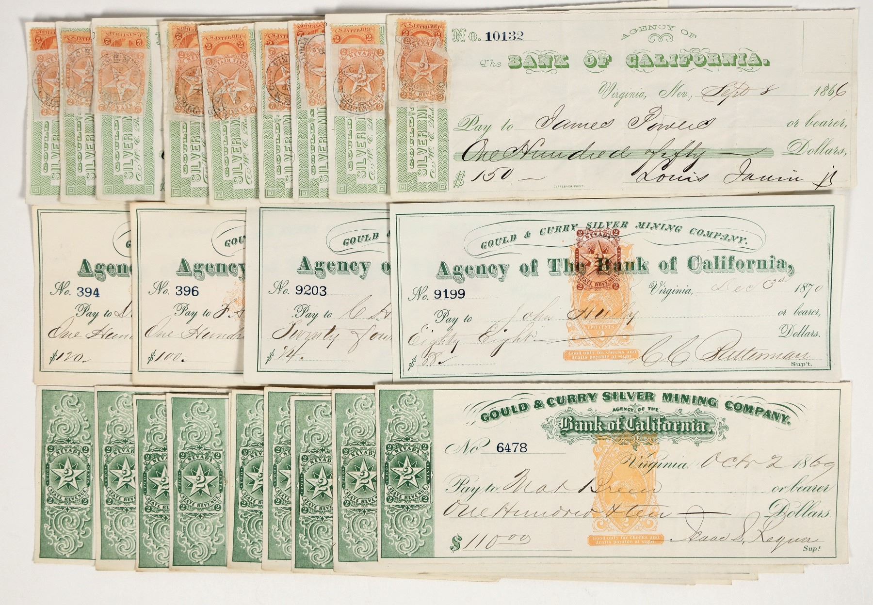 Lot of 24. Four different check types represented. 1-10) Ten Bank of California checks issued in 1866, signed by Louis Janin as supt. All have Nevada and US IR stamps attached. 11-20) Ten Bank of California checks issued in 1869, signed by Isaac Requa. All have RN-B plus printed green NV stamps. 21-22) Two 1870 checks with very rare RN-B17b imprinted revenue, signed by CC Batterman as supt. 23-24) Two 1871 checks with very rare RN-C21b imprinted revenue, also signed by Batterman.