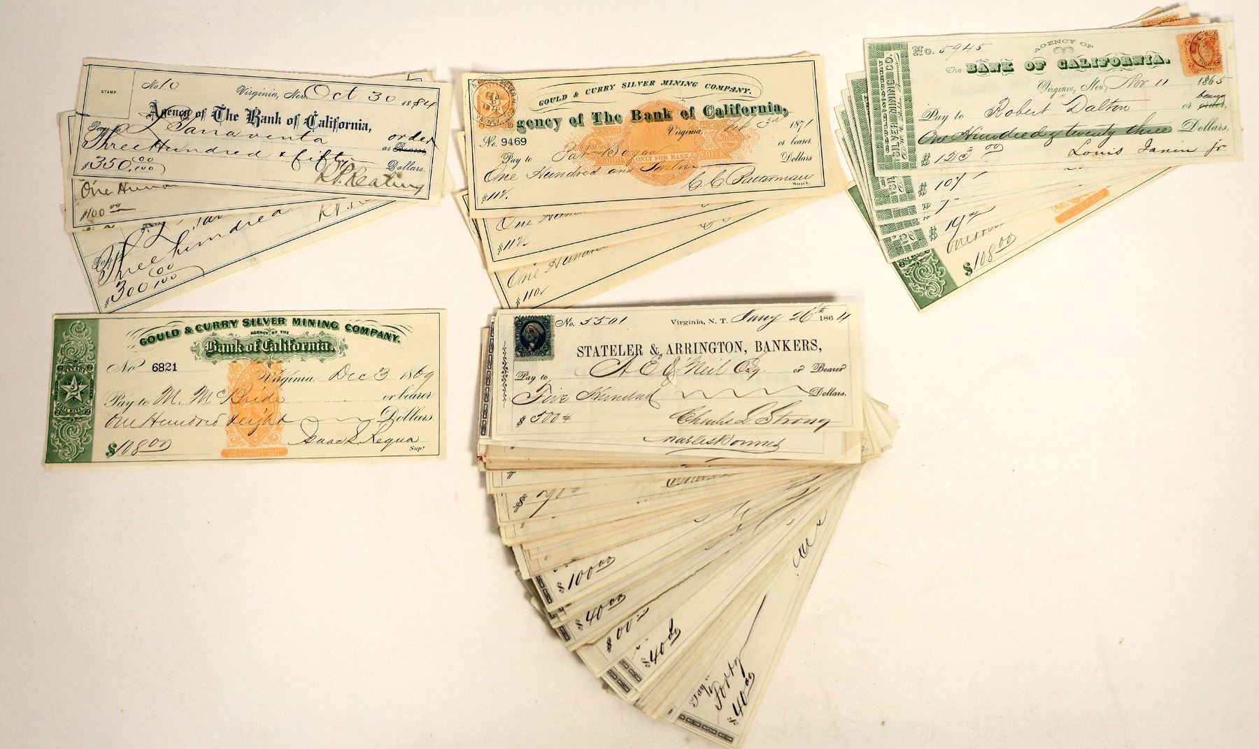 Lot of 73. Includes: 60 Stateler & Arrington territorial checks issued by the Gould & Curry, 1863-64, signed by either Charles Strong or Charles Bonner; two 1869 Gould & Curry signed by Isaac Requa with RN-B and printed green NV stamps; five 1865 G&C signed by Louis Janin; three 1871 G&C with RN-C and orange Nevada adhesive stamps with tied cancels, signed by CC Batterman; and three 1884 Bank of California checks signed by RP Keating.