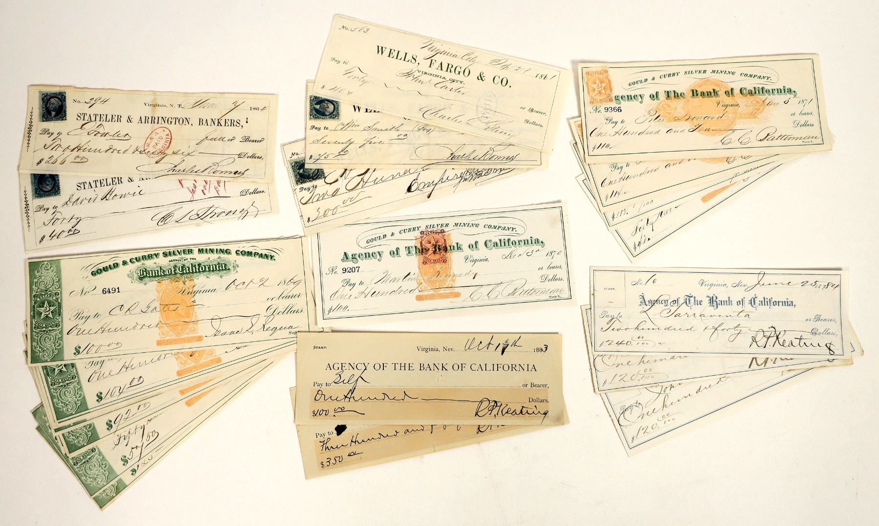 Lot of 25. Includes: 10 Gould & Curry Bank of Cal. checks issued 1869-70, RN-B plus printed green NV stamp, all signed by Isaac Requa; two 1870 Gould & Curry with rare RN-B17b, signed by CC Batterman; 1872 G&C with rare RN-C21b, signed by Batterman; two 1871 G&C with RN-C plus orange NV adhesive, signed by Batterman; very early 1861 Wells Fargo signed by Charles Strong for the G& C; 1864 Wells Fargo signed by RN Graves for Empire Mill & Mining Co.; 1864 Wells Fargo signed by Charles Bonner for G& C; two Stateler & Arrington territorial 1864 checks, one with red cancel; and five 1880s checks signed by RP Keating.