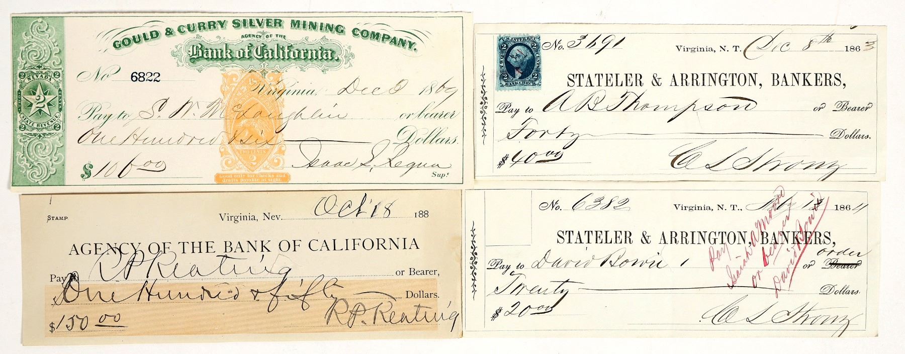 Lot of 4 different. Includes: 1863 Stateler & Arrington to AB Thompson (who worked for the Sutro Tunnel and Hale & Norcross Mine); 1864 check to David Bowie, who would serve as the G&C supt. a couple of years later; 1869 Gould & Curry check with RN-B issued to SW McLaughlin, who was once supt. of the Imperial Mine; and 1880s check issued to and signed by RP Keating as supt. of the Savage Mine.